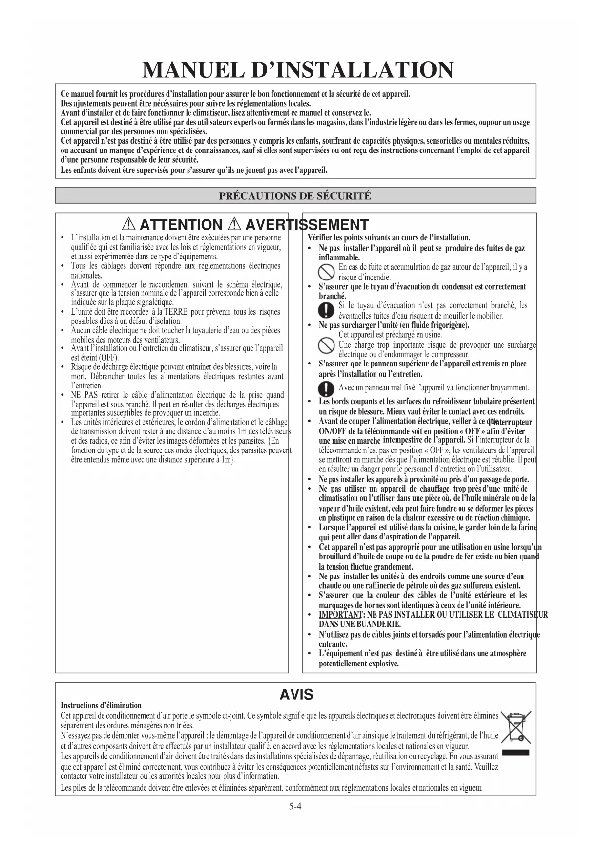 Vérifier les points suivants au cours de l’installation. Ne pas installer l’appareil où il peut se produire des fuites de gaz inflammable. En cas de fuite et accumulation de gaz autour de l’appareil, il y a risque d’incendie. S’assurer que le tuyau d’évacuation du condensat est correctement branché. Si le tuyau d’évacuation n’est pas correctement branché, les éventuelles fuites d’eau risquent de mouiller le mobilier. Ne pas surcharger l’unité (en fluide frigorigène). Cet appareil est préchargé en usine. Une charge trop importante risque de provoquer une surcharge électrique ou d’endommager le compresseur. S’assurer que le panneau supérieur de l’appareil est remis en place après l’installation ou l’entretien. Avec un panneau mal fixé l’appareil va fonctionner bruyamment. Les bords coupants et les surfaces du refroidisseur tubulaire présentent un risque de blessure. Mieux vaut éviter le contact avec ces endroits. Avant de couper l’alimentation électrique, veiller à ce que l’interrupteur ON/OFF de la télécommande soit en position « OFF » afin d’éviter une mise en marche intempestive de l’appareil. Si l’interrupteur de la télécommande n’est pas en position « OFF », les ventilateurs de l’appareil se mettront en marche dès que l’alimentation électrique est rétablie. Il peut en résulter un danger pour le personnel d’entretien ou l’utilisateur. Ne pas installer les appareils à proximité ou près d’un passage de porte. Ne pas utiliser un appareil de chauffage trop près d’une unité de climatisation ou l’utiliser dans une pièce où, de l’huile minérale ou de la vapeur d’huile existent, cela peut faire fondre ou se déformer les pièces en plastique en raison de la chaleur excessive ou de réaction chimique. Lorsque l’appareil est utilisé dans la cuisine, le garder loin de la farine qui peut aller dans d’aspiration de l’appareil. Cet appareil n’est pas approprié pour une utilisation en usine lorsqu’un brouillard d’huile de coupe ou de la poudre de fer existe ou bien quand la tension fluctue grandement. Ne pas installer les unités à des endroits comme une source d’eau chaude ou une raffinerie de pétrole où des gaz sulfureux existent. S’assurer que la couleur des câbles de l’unité extérieure et les marquages de bornes sont identiques à ceux de l’unité intérieure. IMPORTANT: NE PAS INSTALLER OU UTILISER LE CLIMATISEUR DANS UNE BUANDERIE. N’utilisez pas de câbles joints et torsadés pour l’alimentation électrique entrante. L’équipement n’est pas destiné à être utilisé dans une atmosphère potentiellement explosive.