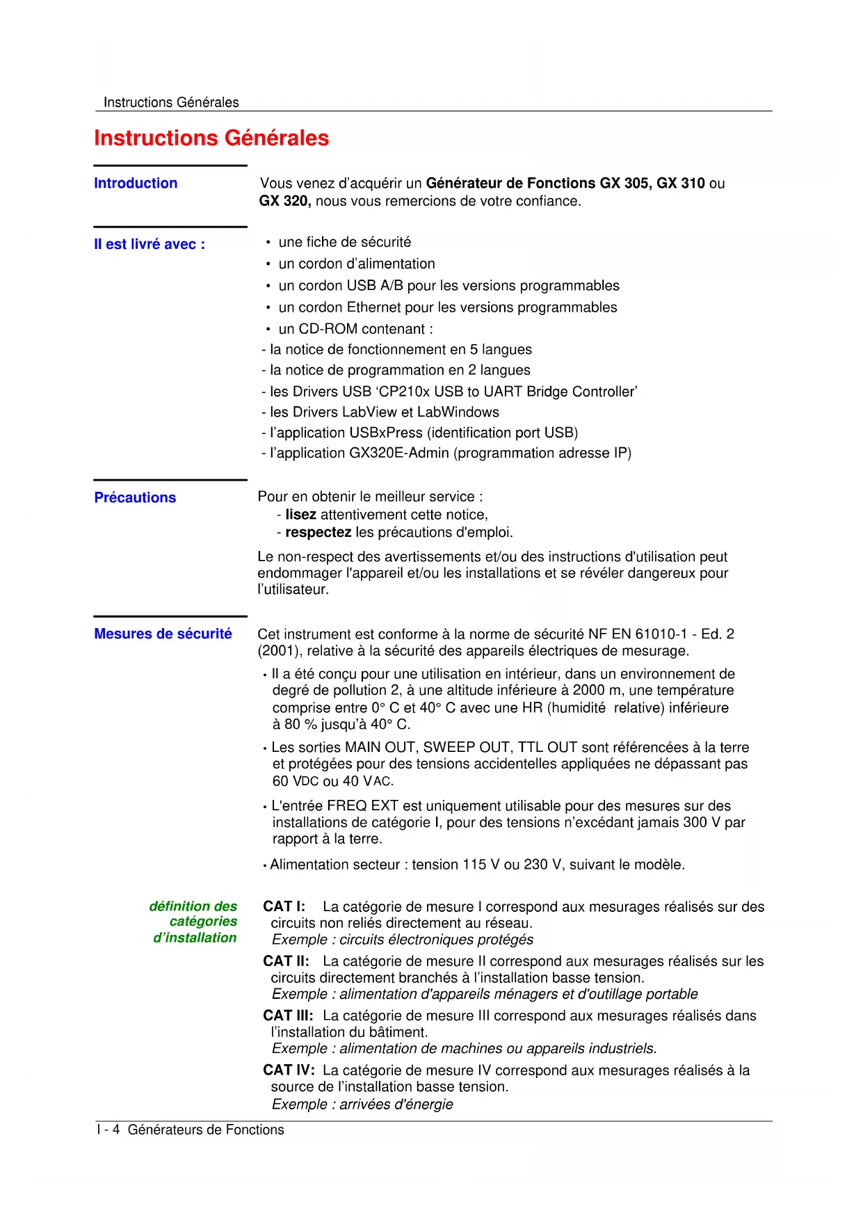 Fourniture ............................................................................................................................................................ 62Instructions Générales I - 4 Générateurs de Fonctions Instructions Générales Introduction Vous venez d’acquérir un Générateur de Fonctions GX 305, GX 310 ou GX 320, nous vous remercions de votre confiance. Il est livré avec :