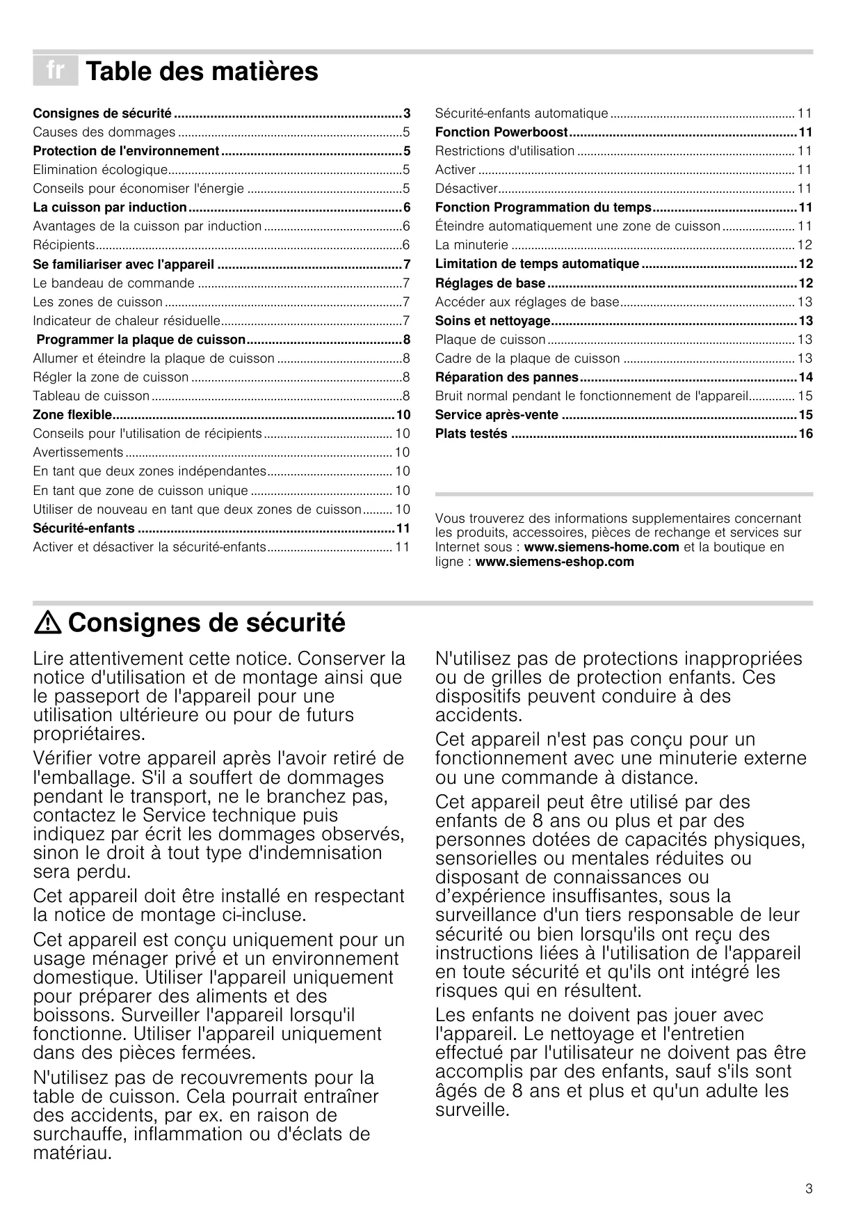 Consignes de sécurité 3 Causes des dommages 5 Protection de l'environnement 5 Elimination écologique5 Conseils pour économiser l'énergie 5 La cuisson par induction 6 Avantages de la cuisson par induction 6 Récipients6 Se familiariser avec l'appareil 7 Le bandeau de commande 7 Les zones de cuisson 7 Indicateur de chaleur résiduelle7 Programmer la plaque de cuisson8 Allumer et éteindre la plaque de cuisson 8 Régler la zone de cuisson 8 Tableau de cuisson 8 Zone flexible10 Conseils pour l'utilisation de récipients 10 Avertissements 10 En tant que deux zones indépendantes 10 En tant que zone de cuisson unique 10 Utiliser de nouveau en tant que deux zones de cuisson 10 Sécurité-enfants 11 Activer et désactiver la sécurité-enfants 11