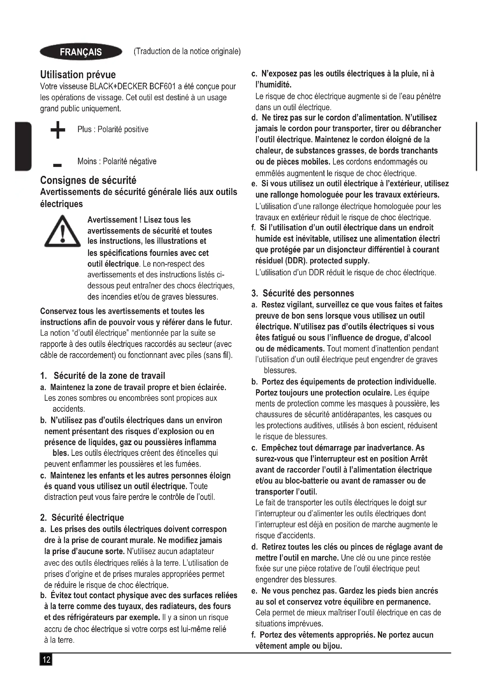 Moins : Polarité négative Consignes de sécurité Avertissements de sécurité générale liés aux outils électriques Avertissement ! Lisez tous les avertissements de sécurité et toutes les instructions, les illustrations et les spécications fournies avec cet outil électrique. Le non-respect des avertissements et des instructions listés ci- dessous peut entraîner des chocs électriques, des incendies et/ou de graves blessures. Conservez tous les avertissements et toutes les instructions an de pouvoir vous y référer dans le futur. La notion “d’outil électrique” mentionnée par la suite se rapporte à des outils électriques raccordés au secteur (avec câble de raccordement) ou fonctionnant avec piles (sans l).