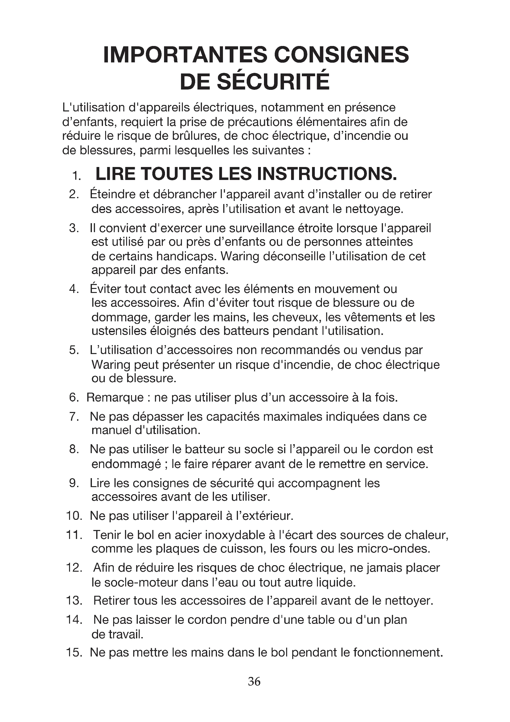 Agitateurs Laver à la main (avec un détergent doux et de l’eau), rincer, sécher et désinfecter. Après chaque utilisation. Pare- éclaboussures amovibles Laver à la main (avec un détergent doux et de l’eau), rincer, sécher et désinfecter. Peut aussi être mis au lave-vaisselle. Après chaque utilisation. Bol Laver à la main (à l'aide d'une éponge ou d'un chiffon, d'eau et de détergent doux), en faisant pression pour vous assurer que le bol est propre, rincer, sécher et désinfecter. Le bol peut aussi être mis au lave-vaisselle. Après chaque utilisation. Partie postérieure du pare- éclaboussures Laver à la main (avec un détergent doux et de l’eau), rincer, sécher et désinfecter. Après chaque utilisation. Support du bol Laver à la main (avec un détergent doux et de l’eau), rincer, sécher et désinfecter. Tous les jours. Arbre planétaire Essuyer avec un chiffon propre et humide, sécher et désinfecter. Appliquer une petite quantité d'huile Waring (huile minérale) sur l'arbre planétaire après le nettoyage. Après chaque utilisation. Extérieur Laver à la main (avec un détergent doux et de l’eau), rincer, sécher et désinfecter. NE PAS laver au jet. Tous les jours.48 IMPORTANT Cet appareil vous offrira des années de service continu, à condition que vous respectiez les consignes suivantes : NETTOYAGE RECOMMANDÉ