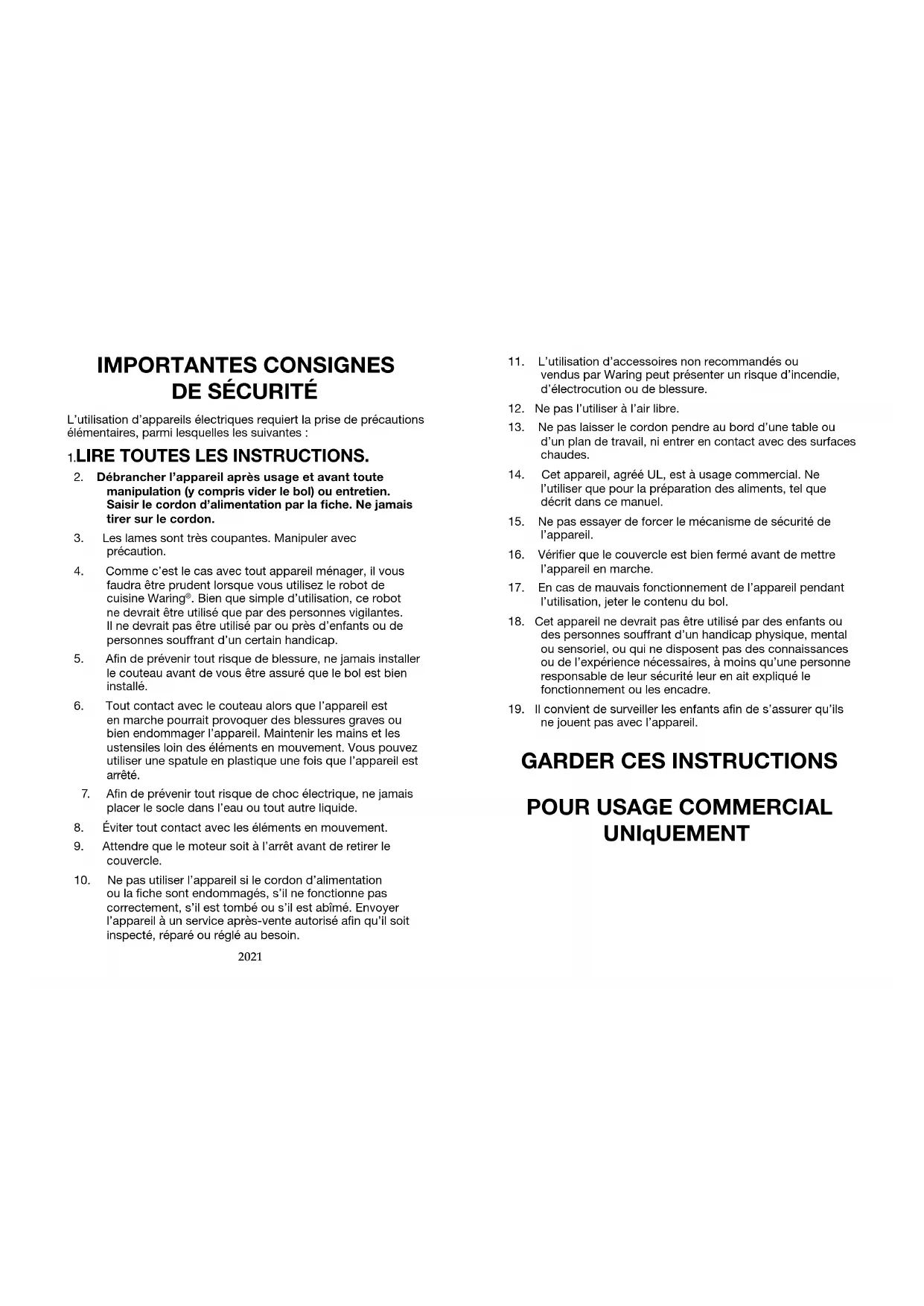faudra être prudent lorsque vous utilisez le robot de cuisine Waring