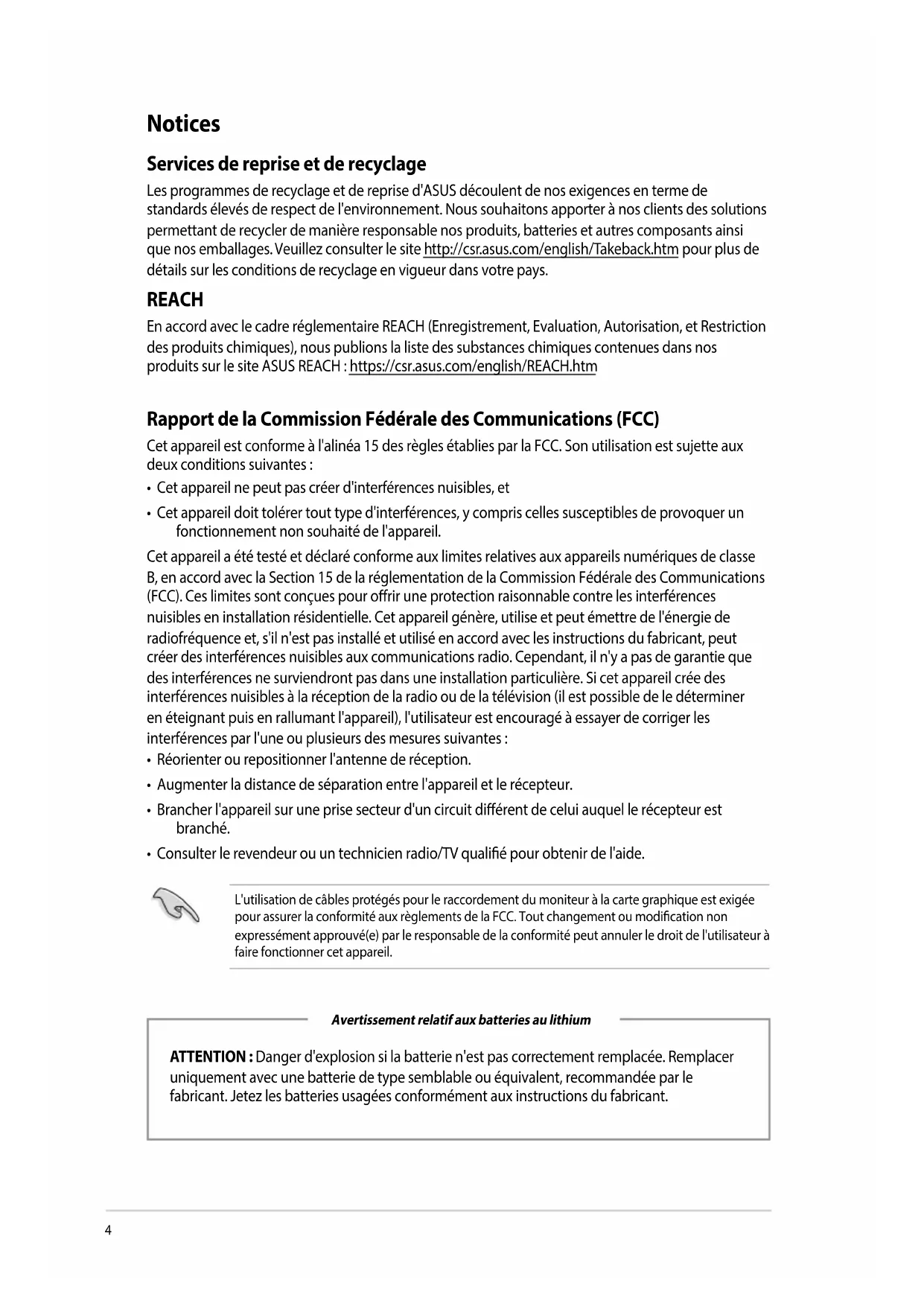 - Mise en veille de l'ordinateur Notices Services de reprise et de recyclage Les programmes de recyclage et de reprise d'ASUS découlent de nos exigences en terme de standards élevés de respect de l'environnement. Nous souhaitons apporter à nos clients des solutions permettant de recycler de manière responsable nos produits, batteries et autres composants ainsi que nos emballages. Veuillez consulter le site http://csr.asus.com/english/Takeback.htm pour plus de détails sur les conditions de recyclage en vigueur dans votre pays. REACH En accord avec le cadre réglementaire REACH (Enregistrement, Evaluation, Autorisation, et Restriction des produits chimiques), nous publions la liste des substances chimiques contenues dans nos produits sur le site ASUS REACH : https://csr.asus.com/english/REACH.htm Rapport de la Commission Fédérale des Communications (FCC) Cet appareil est conforme à l'alinéa 15 des règles établies par la FCC. Son utilisation est sujette aux deux conditions suivantes : p. 474
