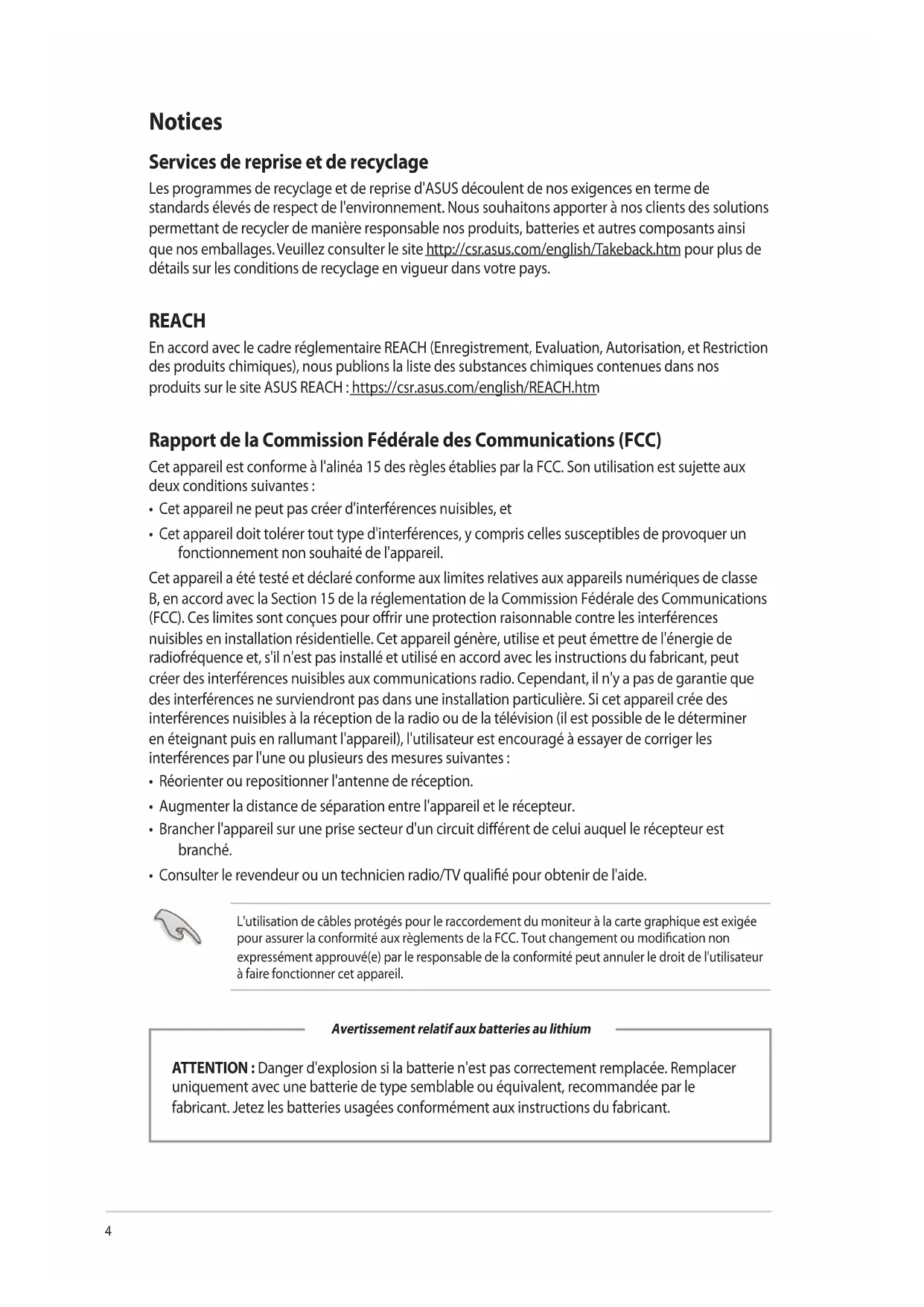 - Mise en veille de l'ordinateur Notices Services de reprise et de recyclage Les programmes de recyclage et de reprise d'ASUS découlent de nos exigences en terme de standards élevés de respect de l'environnement. Nous souhaitons apporter à nos clients des solutions permettant de recycler de manière responsable nos produits, batteries et autres composants ainsi que nos emballages. Veuillez consulter le site http://csr.asus.com/english/Takeback.htm pour plus de détails sur les conditions de recyclage en vigueur dans votre pays. REACH En accord avec le cadre réglementaire REACH (Enregistrement, Evaluation, Autorisation, et Restriction des produits chimiques), nous publions la liste des substances chimiques contenues dans nos produits sur le site ASUS REACH : https://csr.asus.com/english/REACH.htm Rapport de la Commission Fédérale des Communications (FCC) Cet appareil est conforme à l'alinéa 15 des règles établies par la FCC. Son utilisation est sujette aux deux conditions suivantes : p. 454