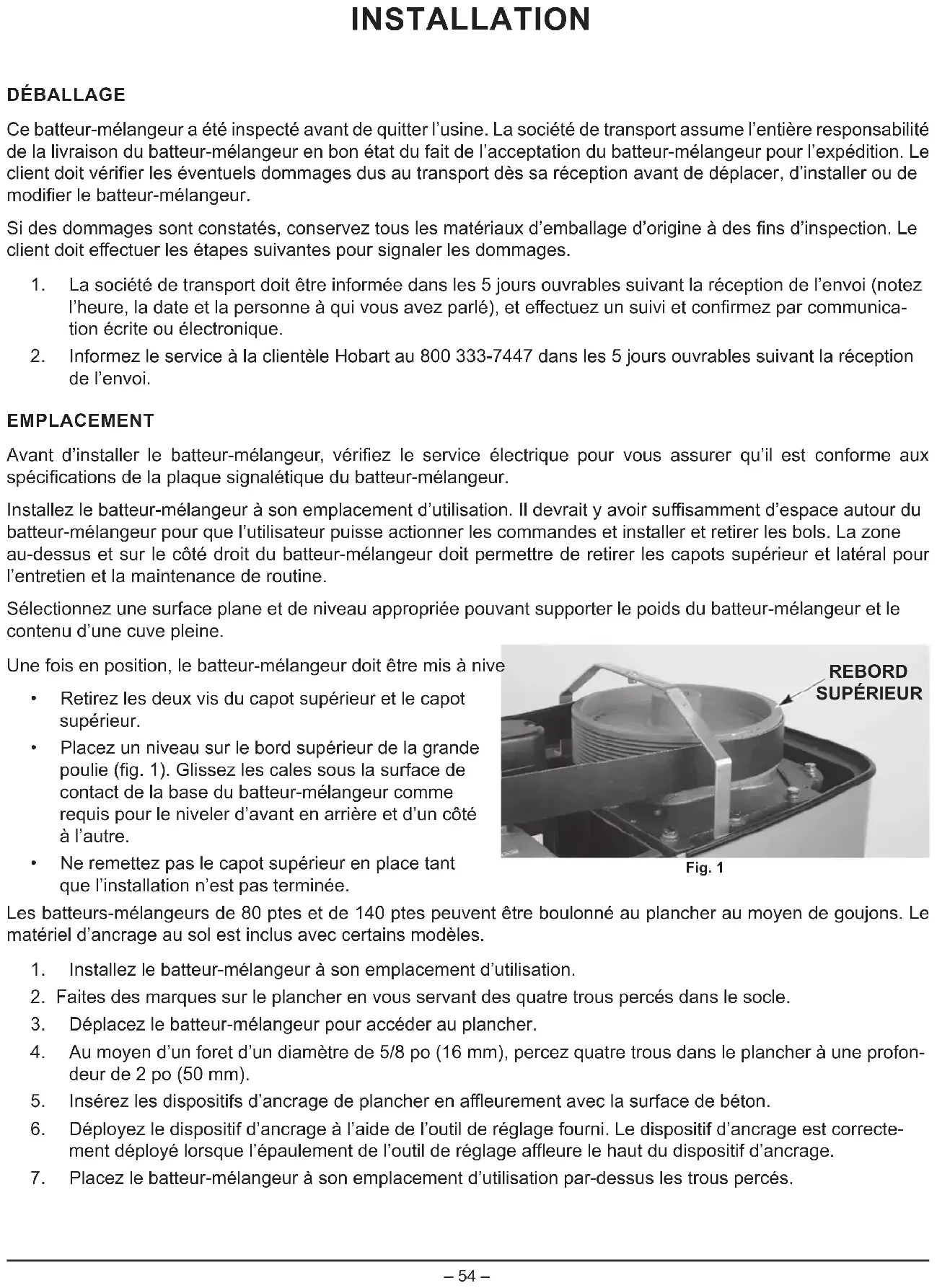 +REDUWVHUpVHUYHOHGURLWGHPRGL¿HUODFRQFHSWLRQGHVHVSURGXLWVVDQVSUpDYLV6LYRXVDYH]GHVTXHVWLRQV FRQFHUQDQWOHVGpWDLOVGXPpODQJHXUQRQLQFOXVGDQVFHPDQXHOFRQWDFWH]YRWUHEXUHDXGHVHUYLFH+REDUWORFDO– 54 – INSTALLATION DÉBALLAGE Ce batteur-mélangeur a été inspecté avant de quitter l’usine. La société de transport assume l’entière responsabilité de la livraison du batteur-mélangeur en bon état du fait de l’acceptation du batteur-mélangeur pour l’expédition. Le FOLHQWGRLWYpUL¿HUOHVpYHQWXHOVGRPPDJHVGXVDXWUDQVSRUWGqVVDUpFHSWLRQDYDQWGHGpSODFHUG¶LQVWDOOHURXGH PRGL¿HUOHEDWWHXUPpODQJHXU 6LGHVGRPPDJHVVRQWFRQVWDWpVFRQVHUYH]WRXVOHVPDWpULDX[G¶HPEDOODJHG¶RULJLQHjGHV¿QVG¶LQVSHFWLRQ/H FOLHQWGRLWHႇHFWXHUOHVpWDSHVVXLYDQWHVSRXUVLJQDOHUOHVGRPPDJHV /DVRFLpWpGHWUDQVSRUWGRLWrWUHLQIRUPpHGDQVOHVMRXUVRXYUDEOHVVXLYDQWODUpFHSWLRQGHO¶HQYRLQRWH] O¶KHXUHODGDWHHWODSHUVRQQHjTXLYRXVDYH]SDUOpHWHႇHFWXH]XQVXLYLHWFRQ¿UPH]SDUFRPPXQLFD- tion écrite ou électronique. ,QIRUPH]OHVHUYLFHjODFOLHQWqOH+REDUWDXGDQVOHVMRXUVRXYUDEOHVVXLYDQWODUpFHSWLRQ de l’envoi. EMPLACEMENT $YDQW G¶LQVWDOOHU OH EDWWHXUPpODQJHXU YpUL¿H] OH VHUYLFH pOHFWULTXH SRXU YRXV DVVXUHU TX¶LO HVW FRQIRUPH DX[ VSpFL¿FDWLRQVGHODSODTXHVLJQDOpWLTXHGXEDWWHXUPpODQJHXU ,QVWDOOH]OHEDWWHXUPpODQJHXUjVRQHPSODFHPHQWG¶XWLOLVDWLRQ,OGHYUDLW\DYRLUVXႈVDPPHQWG¶HVSDFHDXWRXUGX EDWWHXUPpODQJHXUSRXUTXHO¶XWLOLVDWHXUSXLVVHDFWLRQQHUOHVFRPPDQGHVHWLQVWDOOHUHWUHWLUHUOHVEROV/D]RQH au-dessus et sur le côté droit du batteur-mélangeur doit permettre de retirer les capots supérieur et latéral pour l’entretien et la maintenance de routine. 6pOHFWLRQQH]XQHVXUIDFHSODQHHWGHQLYHDXDSSURSULpHSRXYDQWVXSSRUWHUOHSRLGVGXEDWWHXUPpODQJHXUHWOH contenu d’une cuve pleine. Une fois en position, le batteur-mélangeur doit être mis à niveau : 5HWLUH]OHVGHX[YLVGXFDSRWVXSpULHXUHWOHFDSRW supérieur. 3ODFH]XQQLYHDXVXUOHERUGVXSpULHXUGHODJUDQGH