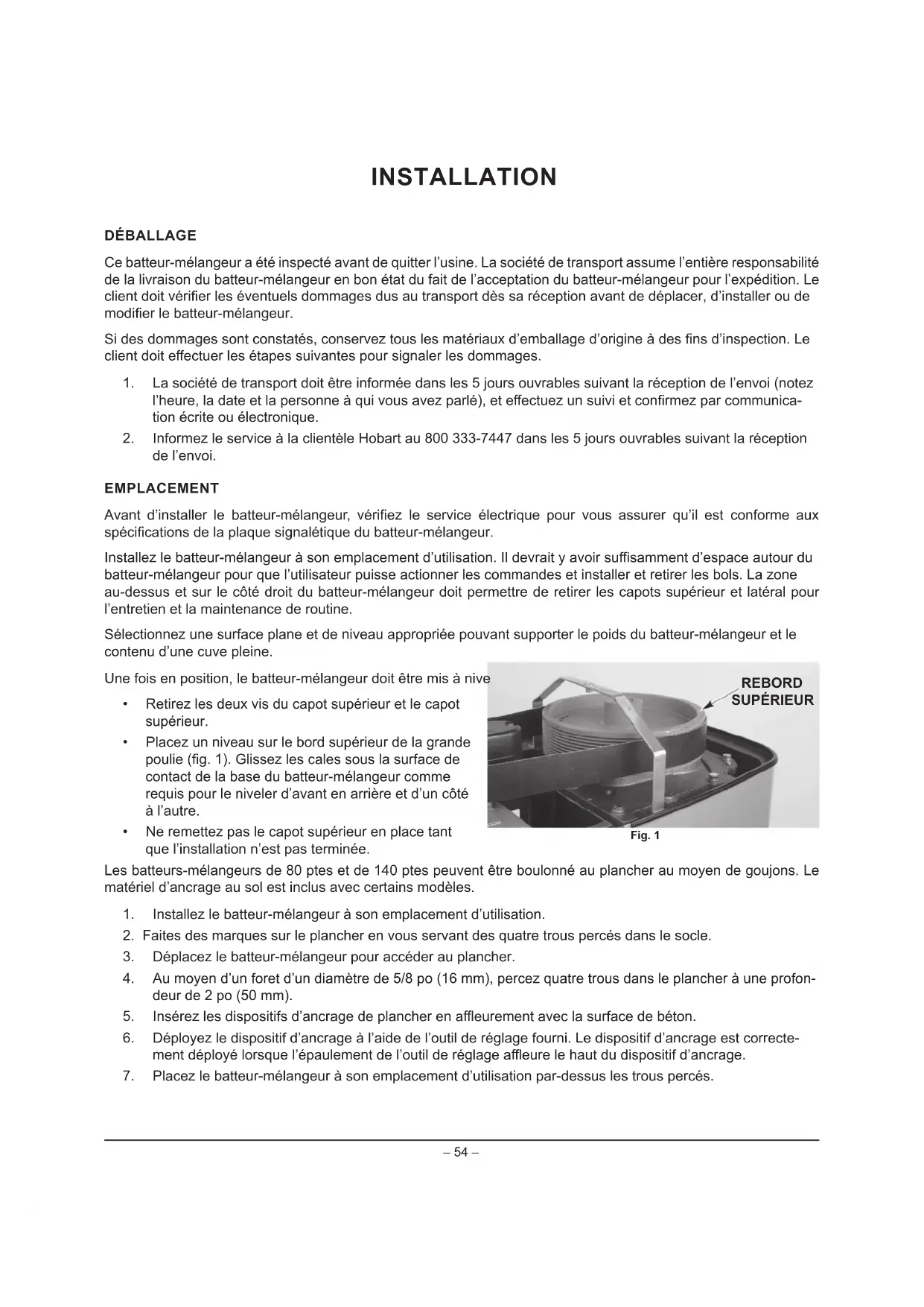 +REDUWVHUpVHUYHOHGURLWGHPRGL¿HUODFRQFHSWLRQGHVHVSURGXLWVVDQVSUpDYLV6LYRXVDYH]GHVTXHVWLRQV FRQFHUQDQWOHVGpWDLOVGXPpODQJHXUQRQLQFOXVGDQVFHPDQXHOFRQWDFWH]YRWUHEXUHDXGHVHUYLFH+REDUWORFDO– 54 – INSTALLATION DÉBALLAGE Ce batteur-mélangeur a été inspecté avant de quitter l’usine. La société de transport assume l’entière responsabilité de la livraison du batteur-mélangeur en bon état du fait de l’acceptation du batteur-mélangeur pour l’expédition. Le FOLHQWGRLWYpUL¿HUOHVpYHQWXHOVGRPPDJHVGXVDXWUDQVSRUWGqVVDUpFHSWLRQDYDQWGHGpSODFHUG¶LQVWDOOHURXGH PRGL¿HUOHEDWWHXUPpODQJHXU 6LGHVGRPPDJHVVRQWFRQVWDWpVFRQVHUYH]WRXVOHVPDWpULDX[G¶HPEDOODJHG¶RULJLQHjGHV¿QVG¶LQVSHFWLRQ/H FOLHQWGRLWHႇHFWXHUOHVpWDSHVVXLYDQWHVSRXUVLJQDOHUOHVGRPPDJHV /DVRFLpWpGHWUDQVSRUWGRLWrWUHLQIRUPpHGDQVOHVMRXUVRXYUDEOHVVXLYDQWODUpFHSWLRQGHO¶HQYRLQRWH] O¶KHXUHODGDWHHWODSHUVRQQHjTXLYRXVDYH]SDUOpHWHႇHFWXH]XQVXLYLHWFRQ¿UPH]SDUFRPPXQLFD- tion écrite ou électronique. ,QIRUPH]OHVHUYLFHjODFOLHQWqOH+REDUWDXGDQVOHVMRXUVRXYUDEOHVVXLYDQWODUpFHSWLRQ de l’envoi. EMPLACEMENT $YDQW G¶LQVWDOOHU OH EDWWHXUPpODQJHXU YpUL¿H] OH VHUYLFH pOHFWULTXH SRXU YRXV DVVXUHU TX¶LO HVW FRQIRUPH DX[ VSpFL¿FDWLRQVGHODSODTXHVLJQDOpWLTXHGXEDWWHXUPpODQJHXU ,QVWDOOH]OHEDWWHXUPpODQJHXUjVRQHPSODFHPHQWG¶XWLOLVDWLRQ,OGHYUDLW\DYRLUVXႈVDPPHQWG¶HVSDFHDXWRXUGX EDWWHXUPpODQJHXUSRXUTXHO¶XWLOLVDWHXUSXLVVHDFWLRQQHUOHVFRPPDQGHVHWLQVWDOOHUHWUHWLUHUOHVEROV/D]RQH au-dessus et sur le côté droit du batteur-mélangeur doit permettre de retirer les capots supérieur et latéral pour l’entretien et la maintenance de routine. 6pOHFWLRQQH]XQHVXUIDFHSODQHHWGHQLYHDXDSSURSULpHSRXYDQWVXSSRUWHUOHSRLGVGXEDWWHXUPpODQJHXUHWOH contenu d’une cuve pleine. Une fois en position, le batteur-mélangeur doit être mis à niveau : 5HWLUH]OHVGHX[YLVGXFDSRWVXSpULHXUHWOHFDSRW supérieur. 3ODFH]XQQLYHDXVXUOHERUGVXSpULHXUGHODJUDQGH