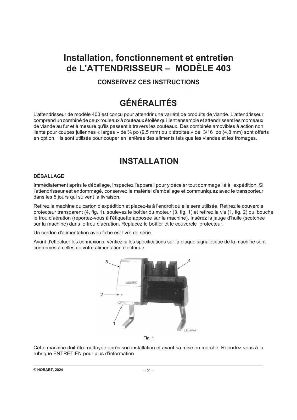 L'attendrisseur de modèle 403 est conçu pour attendrir une variété de produits de viande. L'attendrisseur comprend un combiné de deux rouleaux à couteaux étoilés qui lient ensemble et attendrissent les morceaux de viande au fur et à mesure qu'ils passent à travers les couteaux. Des combinés amovibles à action non liante pour coupes juliennes « larges » de ⅜ po (9,5 mm) ou « étroites » de 3/16 po (4,8 mm) sont offerts en option. Ils sont utilisés pour couper en lanières des aliments tels que les viandes et les fromages. INSTALLATION DÉBALLAGE Immédiatement après le déballage, inspectez l’appareil pour y déceler tout dommage lié à l'expédition. Si l'attendrisseur est endommagé, conservez le matériel d'emballage et communiquez avec le transporteur dans les 5 jours qui suivent la livraison. Retirez la machine du carton d'expédition et placez-la à l’endroit où elle sera utilisée. Retirez le couvercle protecteur transparent (4, g. 1), soulevez le boîtier du moteur (3, g. 1) et retirez la vis (1, g. 2) qui bouche le trou d'aération (reportez-vous à l'étiquette apposée sur la machine). Insérez la jauge d’huile (scotchée sur la machine) dans le trou d'aération. Replacez le boîtier et le couvercle protecteur. Un cordon d'alimentation avec che est livré de série. Avant d'effectuer les connexions, vériez si les spécications sur la plaque signalétique de la machine sont conformes à celles de votre alimentation électrique. Fig. 1 Cette machine doit être nettoyée après son installation et avant sa mise en marche. Reportez-vous à la rubrique ENTRETIEN pour plus d’information. © HOBART, 2024– 3 – SÉCURITÉ Chaque fois que cette machine est en service, les dispositifs de sécurité qui y sont intégrés DOIVENT être correctement placés à leur position de fonctionnement. Le couvercle protecteur transparent et le boîtier du moteur doivent être en place. Même si le commutateur est activé, le voyant lumineux (2, g.