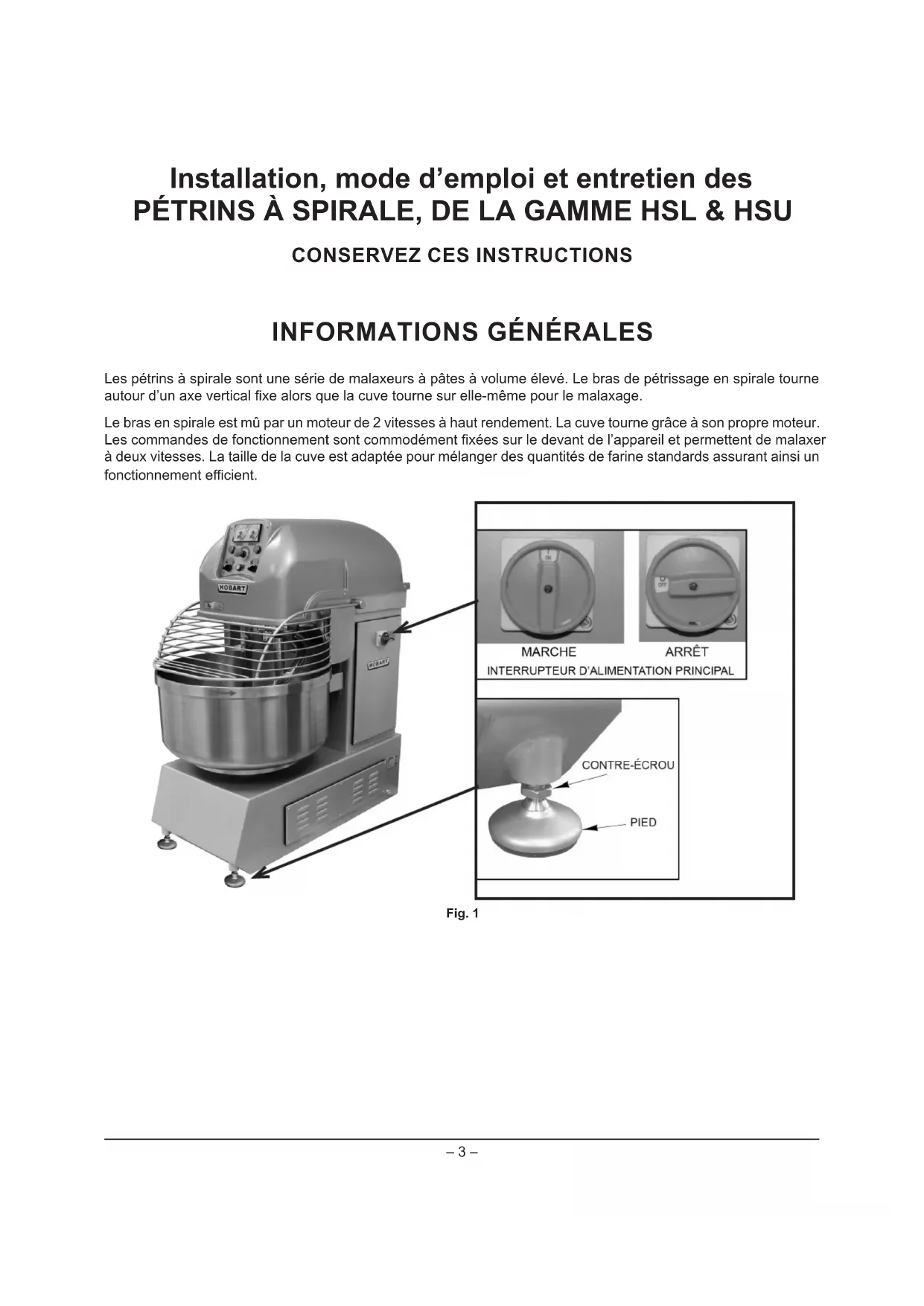 Le pétrin à spirale devrait être posé dans une zone raisonnablement de niveau. Après l’avoir placé en position, dévissez les pieds de stabilisation xés sur les coins avant (Fig. 1); ensuite serrez les contreécrous avant de commencer l’installation. CONNEXIONS ÉLECTRIQUES Les connexions électriques et de mise à la terre doivent se faire en conformité avec les dispositions applicables du Code national électrique et/ou des autres codes électriques locaux. Un orice de 1 po (25 mm) est percé à l’arrière du pétrin/malaxeur pour passer un conduit de câble commercial de 1 po (25 mm). Faites les raccordements électriques selon le schéma de câblage logé à l’intérieur de la boîte électrique sur le côté de l’appareil.