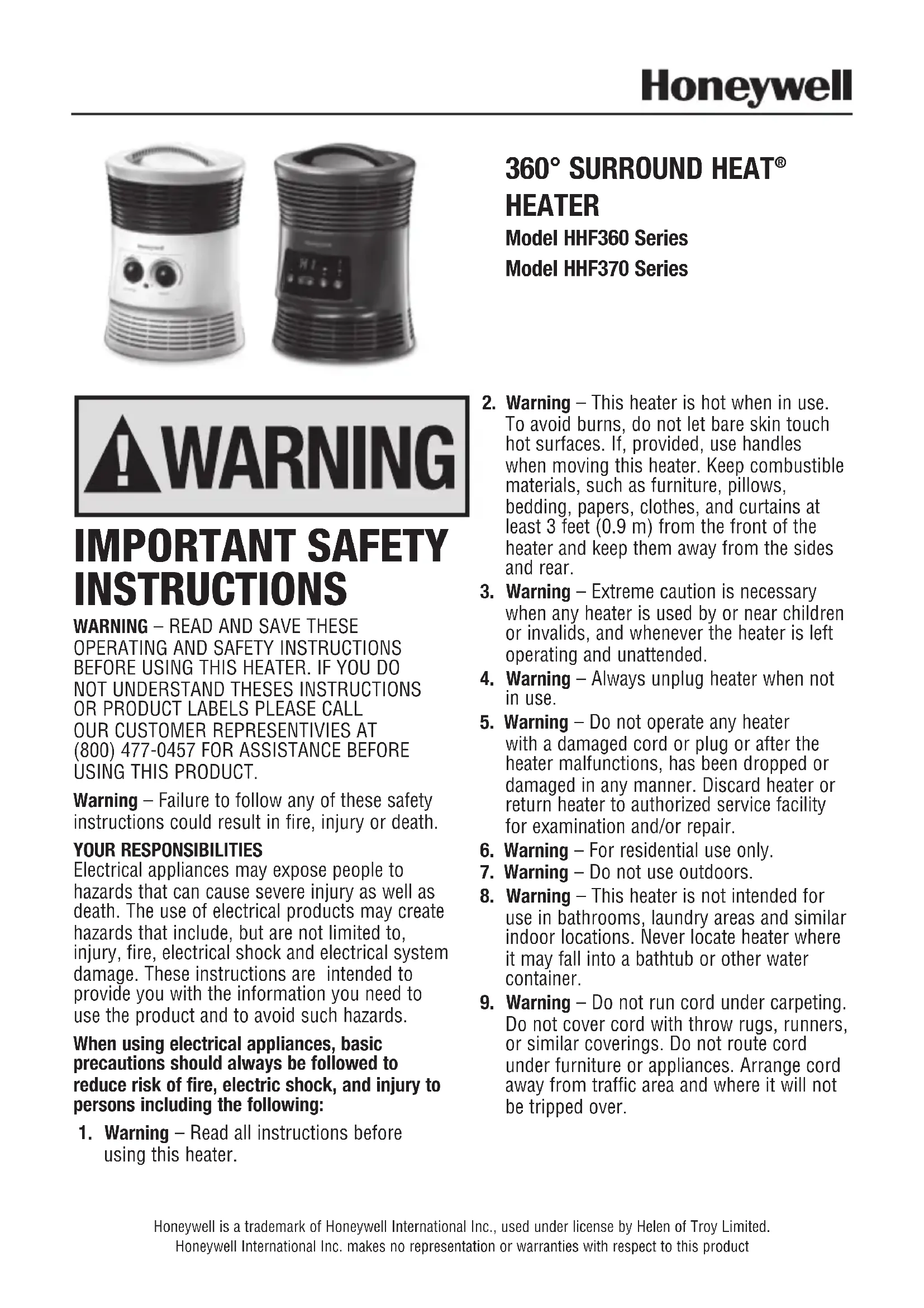 Modelo de la serie HHF360 Modelo de la serie HHF370 © 2015 Kaz USA, Inc. Tous droits réservés.Fabriqué par Kaz USA, Inc. 250 Turnpike Rd. Southborough, MA 01772 Distribué par Kaz Canada, Inc. 510 Bronte St S Milton, ON L9T 2X6Surround Heat est une marque déposée de Helen of Troy Limited.Safety Tip est une marque de commerce de Helen of Troy Limited. P/N: 31IMH367190 IMPORTANTES INSTRUCCIONES DE SEGURIDAD