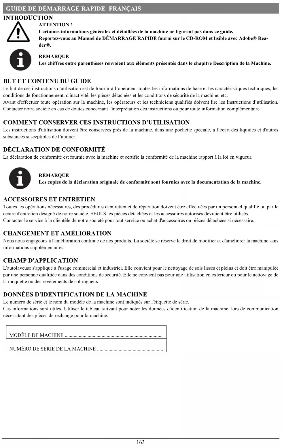 /h) Poids de la machine avec des réservoirs vides (sans batteries) kg/lbs. 58 Kg / 128 Lbs. Masse totale en charge (MTC) kg/lbs. 134 Kg / 295 Lbs. Poids d’expédition kg/lbs. 137 Kg / 302 Lbs. Dimensions de l'emballage (L x l x h) mm/pouces (1130 x 730 x 1040 mm) / (44.5 x 28.7 x 41 pouces) (*) : OptionsGUIDE DE DÉMARRAGE RAPIDE FRANÇAIS