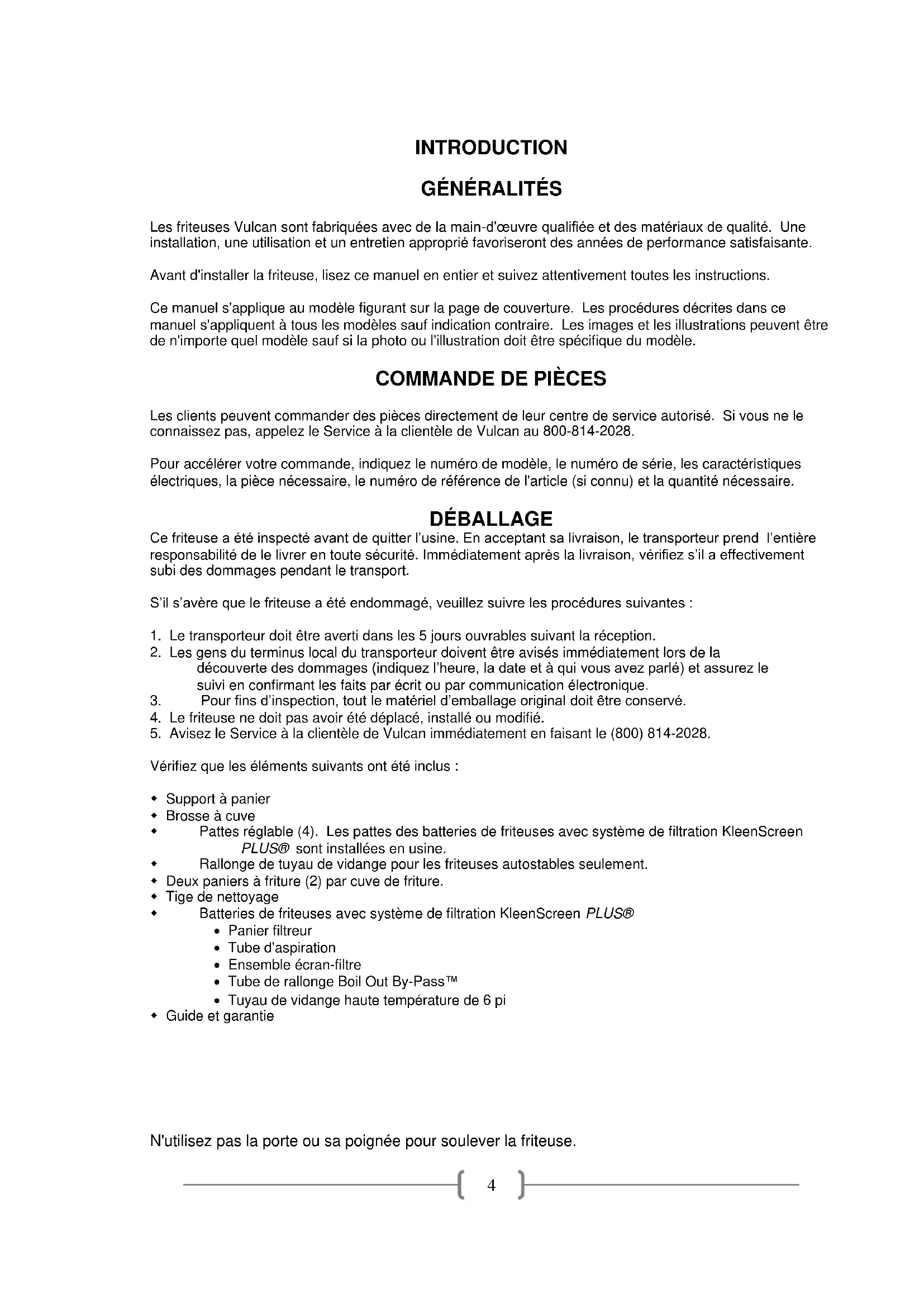 Les clients peuvent commander des pièces directement de leur centre de service autorisé. Si vous ne le connaissez pas, appelez le Service à la clientèle de Vulcan au 800-814-2028. Pour accélérer votre commande, indiquez le numéro de modèle, le numéro de série, les caractéristiques électriques, la pièce nécessaire, le numéro de référence de l'article (si connu) et la quantité nécessaire. DÉBALLAGE Ce friteuse a été inspecté avant de quitter l’usine. En acceptant sa livraison, le transporteur prend l’entière responsabilité de le livrer en toute sécurité. Immédiatement après la livraison, vérifiez s’il a effectivement subi des dommages pendant le transport. S’il s’avère que le friteuse a été endommagé, veuillez suivre les procédures suivantes :
