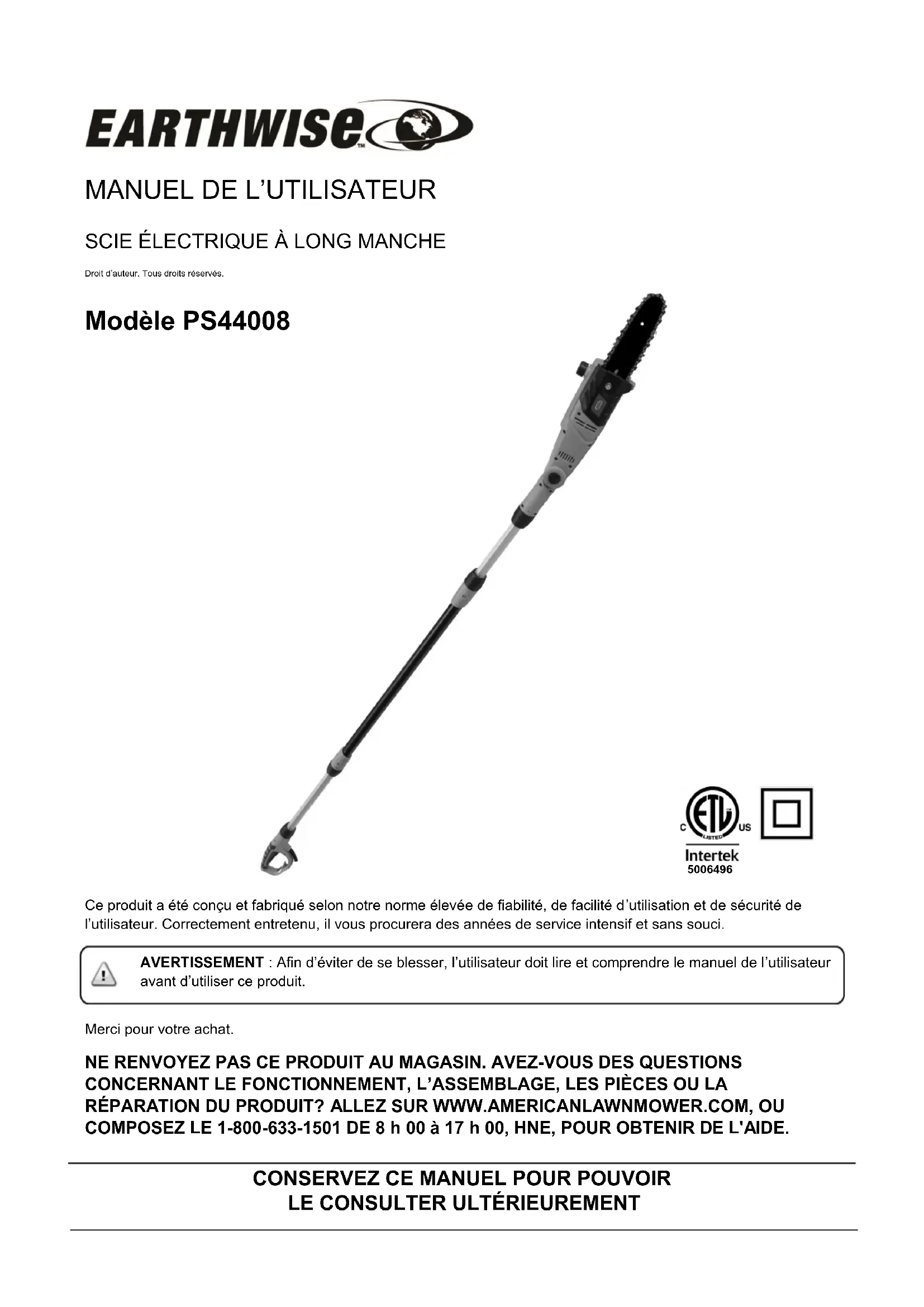 Modèle PS44008Problème Cause possible Solution possible − L'appareil ne fonctionne pas − La rallonge n’est pas branchée sur la prise − Vérifiez si la rallonge est complètement raccordée à l’outil − Le câble n’est pas branché sur la source d’alimentation − Vérifiez si la rallonge est complètement raccordée à une prise sous tension − Gâchette non complètement activée − Vérifiez que le déverrouillage est à fond vers l’avant avant d’activer la gâchette — Le guide-chaîne et la chaîne chauf fent et fument − Vérifier si la chaîne est excessivement tendue − Régler la tension de la chaîne − Le réservoir d’huile de chaîne est vide − Remplir le réservoir d’huile de chaîne − Chaîne installée à l'envers − nverser la chaîne pour que les gouges soient dans la direction — Le moteur tourne mais pas la chaîne − Tension excessive de la chaîne − Régler la tension de la chaîne − Vérifier si le guide-chaîne et la chaîne sont endommagés − Remplacer le guide-chaîne et la chaîne avec des pièces de rechange identiques REMISAGE Remisez le outil dans un endroit sec, propre et hors de portée des enfants. Lors d'un remisage pendant des périodes de temps prolongées, assurez-vous que le cultivateur/la griffe est protégé contre la corrosion et le gel. À la fin de la saison, ou si le outil n'est pas utilisé pendant plus d'un mois, essuyez toutes les surfaces en métal avec un chiffon imprégné d’huile pour les protéger contre la corrosion, ou vaporisez une fine couche d’huile. DÉPANNAGE APPELEZ-NOUS D’ABORD!! RÉPARATION Pour les pièces ou la réparation, veuillez appeler le 1-800-633-1501 ou visitez-nous en ligne au www.americanlawnmower.com. Veillez fournir toute l'information pertinente lorsque vous nous appelez ou nous rendez visite. PIÈCES DE RECHANGE (KITS/ ARTICLES) Le numéro de modèle/ de série de cet outil se trouve sur une plaque ou une étiquette fixée au bâti. Notez votre numéro de série dans l’espace prévu ci-dessous.
