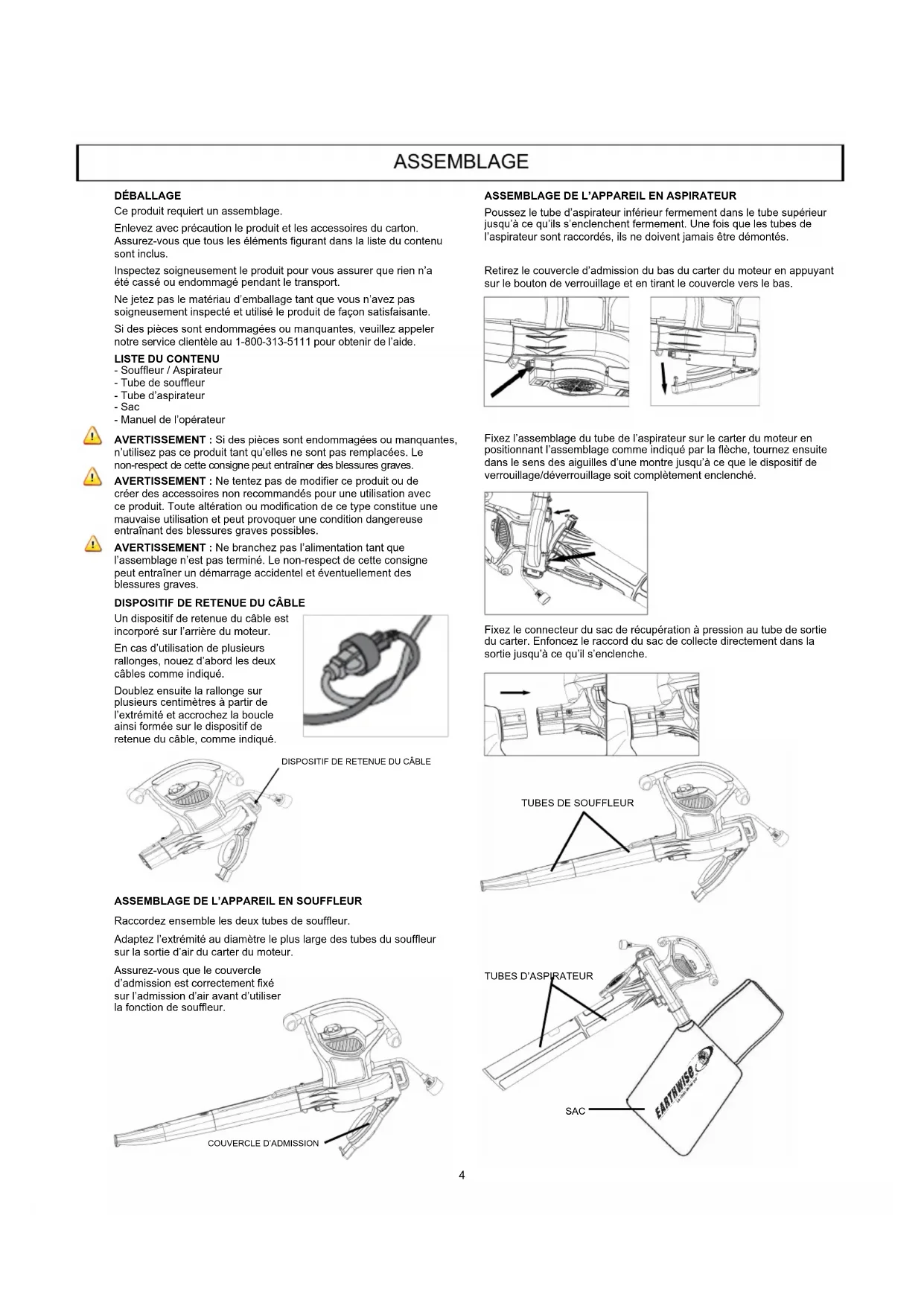 3. Retirez le tube d’aspiration et enlevez le ou les objets qui bloquent le ventilateur. 4. Remontez le tube d’aspiration. Laissez le moteur refroidir pendant trois (3) minutes. Rebranchez l’appareil et mettez l’interrupteur sur sa position de marche. Le souffleur/aspirateur reprendra son fonctionnement normal. Mettez le contacteur sur la position d’arrêt et débranchez l’outil de l’alimentation électrique : - pour passer du souffleur à l’aspirateur. - si le câble d’alimentation est endommagé ou enchevêtré. - si vous laissez le produit sans surveillance. - pour dégager une obstruction. - pour vérifier, régler, nettoyer ou travailler sur l’outil. Si l’appareil tombe, vérifiez soigneusement s’il est endommagé. Si le carter est fendu, les poignées cassée ou si vous détectez un autre problème pouvant affecter le fonctionnement de l’outil, contactez votre service clientèle au 1-800-313-5111 pour obtenir de l’aide. MISE EN GARDE : Ne laissez jamais de liquide de frein, d’essence, de produits à base de pétrole, d’huiles pénétrantes, etc. entrer en contact avec les pièces en plastique. Ces substances contiennent des produits chimiques pouvant endommager, affaiblir ou détruire le plastique. IMPORTANT : Pour garantir la SÉCURITÉ et la FIABILITÉ du produit, les réparations, la maintenance et le réglage doivent être effectués par une personne qualifiée qui utilise toujours des pièces de rechange identiques. Cause possible - La rallonge n’est pas branchée sur la prise - Le câble n’est pas branché sur la source d’alimentation Solution possible - Vérifier si la rallonge est complètement raccordée à l’outil - Vérifier si la rallonge est complètement raccordée à une prise sous tension Problème - L’appareil ne fonctionne pas DÉPANNAGE Nettoyez tout matériau pouvant s’être accumulé dans l’appareil. Dans le cadre d’une utilisation correcte avec des feuilles sèches, le logement du ventilateur de l’appareil doit rester propre. Si de la terre et des débris mouillés sont aspirés, des particules risquent de s’accumuler sur l’intéri-eur du logement du souffleur. Dans ce cas, le rendement de l’appareil baisse. Cette zone peut être nettoyée en essuyant doucement avec un chiffon mouillé après débranchement de la source d’alimentation. Votre appareil doit être rangé dans un endroit sec. Une fois par an, lavez le sac à la main avec de l’eau savonneuse. Laissez-le sécher à l’air sec. Assurez-vous que le câble est détaché de l’appareil, n’utilisez ensuite que du savon doux et un chiffon mouillé pour nettoyer l’outil. Ne laissez jamais de liquide entrer dans l’outil; n’immergez jamais une partie de l’outil dans du liquide. Les engrais et autres produits chimiques de jardinage contiennent des agents qui accélèrent fortement la corrosion des métaux. Ne rangez pas l’outil sur ou à côté d’engrais ou de produits chimiques. MAINTENANCE Appelez-nous d’abord pour toute question concernant le concernant la maintenance de votre souffleur/aspirateur au 1-800-313-5111 entre 8 h 00 et 17 h 00, HNE, ou envoyez vos courriels à earthwise@reelin.com. APPELEZ-NOUS D’ABORD!!