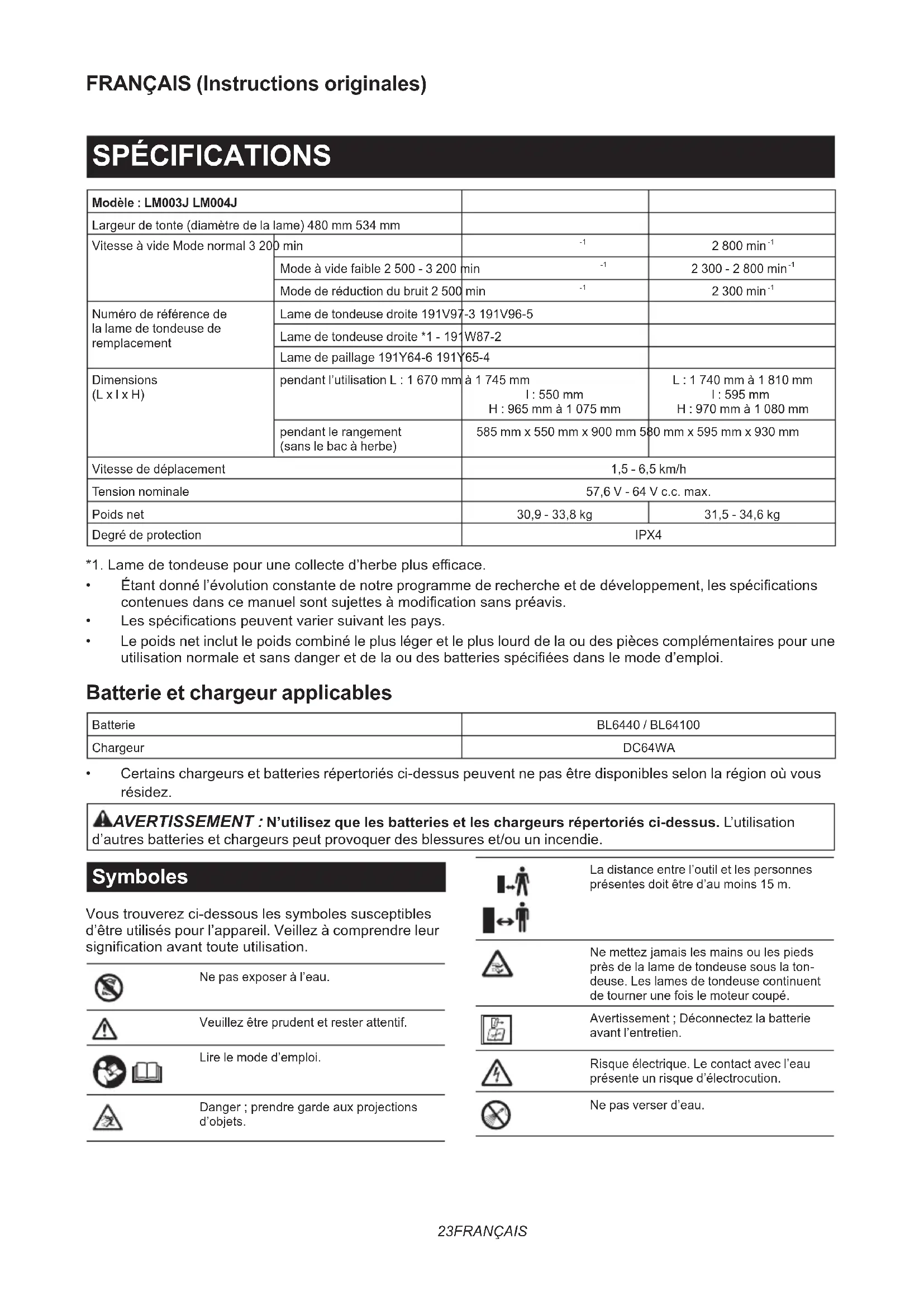 Numéro de référence de la lame de tondeuse de remplacement Lame de tondeuse droite 191V97-3 191V96-5 Lame de tondeuse droite *1 - 191W87-2 Lame de paillage 191Y64-6 191Y65-4 Dimensions (L x l x H) pendant l’utilisation L : 1 670 mm à 1 745 mm l : 550 mm H : 965 mm à 1 075 mm L : 1 740 mm à 1 810 mm l : 595 mm H : 970 mm à 1 080 mm pendant le rangement (sans le bac à herbe) 585 mm x 550 mm x 900 mm 580 mm x 595 mm x 930 mm Vitesse de déplacement 1,5 - 6,5 km/h Tension nominale 57,6 V - 64 V c.c. max. Poids net 30,9 - 33,8 kg 31,5 - 34,6 kg Degré de protection IPX4 *1. Lame de tondeuse pour une collecte d’herbe plus ecace.