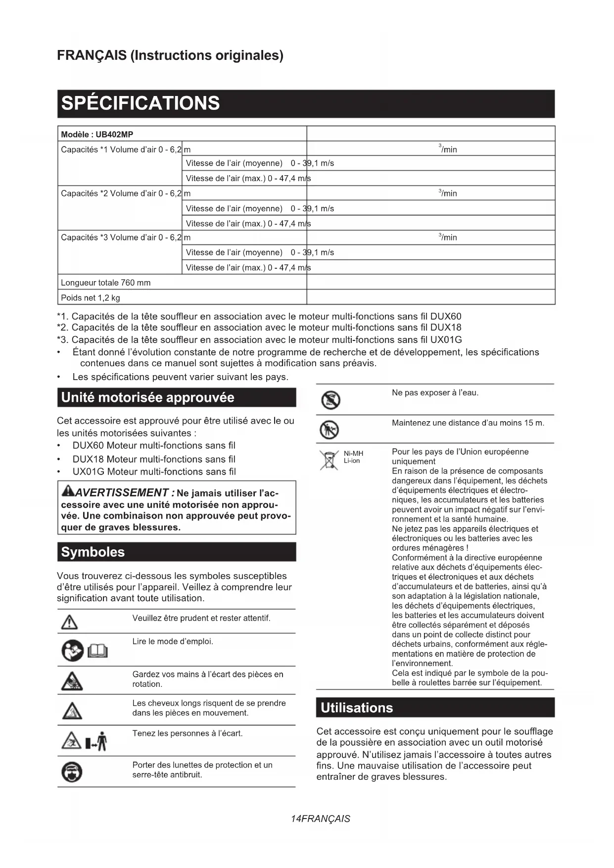 cessoire avec une unité motorisée non approu- vée. Une combinaison non approuvée peut provo- quer de graves blessures. Symboles Voustrouverezci-dessouslessymbolessusceptibles d’être utilisés pour l’appareil. Veillez à comprendre leur signicationavanttouteutilisation. Veuillez être prudent et rester attentif. Lire le mode d’emploi. Gardez vos mains à l’écart des pièces en rotation. Les cheveux longs risquent de se prendre dans les pièces en mouvement. Tenez les personnes à l’écart. Porter des lunettes de protection et un serre-tête antibruit. Ne pas exposer à l’eau. Maintenez une distance d’au moins 15 m. Ni-MH Li-ion Pourlespaysdel’Unioneuropéenne uniquement Enraisondelaprésencedecomposants dangereux dans l’équipement, les déchets d’équipements électriques et électro- niques, les accumulateurs et les batteries peuvent avoir un impact négatif sur l’envi- ronnement et la santé humaine. Ne jetez pas les appareils électriques et électroniques ou les batteries avec les ordures ménagères ! Conformément à la directive européenne relative aux déchets d’équipements élec- triques et électroniques et aux déchets d’accumulateurs et de batteries, ainsi qu’à son adaptation à la législation nationale, les déchets d’équipements électriques, les batteries et les accumulateurs doivent être collectés séparément et déposés dans un point de collecte distinct pour déchets urbains, conformément aux régle- mentations en matière de protection de l’environnement. Celaestindiquéparlesymboledelapou- belle à roulettes barrée sur l’équipement. Utilisations Cetaccessoireestconçuuniquementpourlesouage de la poussière en association avec un outil motorisé approuvé. N’utilisez jamais l’accessoire à toutes autres ns.Unemauvaiseutilisationdel’accessoirepeut entraîner de graves blessures.15 FRANÇAIS Déclaration de conformité CE Pour les pays européens uniquement Nous, fabricants : Makita Europe N.V., adresse com- merciale : Jan-Baptist Vinkstraat 2 3070 Kortenberg BELGIQUE. Autorisons Hiroshi Tsujimura pour la compilationduchiertechniqueetdéclaronssousnotre seuleresponsabilitéqueleoulesproduits; désignation : Tête Soueur, désignation du (des) type(s):UB402MP; Respectent toutes les dispositions pertinentes de la Directive 2006/42/CE et respectent également touteslesdispositionspertinentesdesDirectivesCE/ UEsuivantes:2000/14/CE et sont fabriqués confor- mément aux normes harmonisées suivantes : EN 60335-1:2012+A11:2014+A13:2017+A1:2019+A14:20 19+A2:2019, EN 50636-2-100:2014. Lieu et date de déclaration : Kortenberg, Belgique.