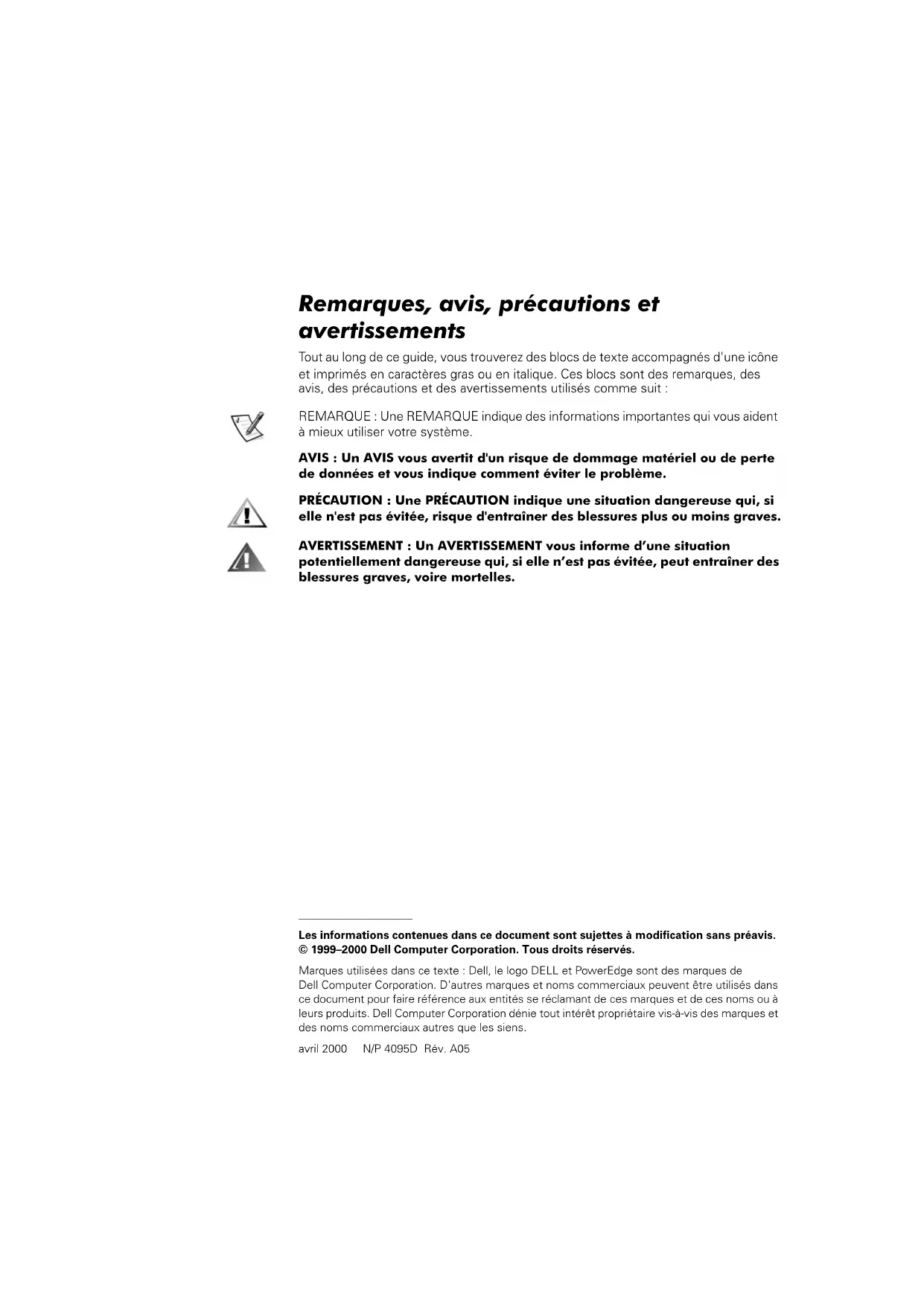 - All other Ultra/Wide SCSI hard-disk drives — Consult your peripheral documentation or the peripheral documentation on the Dell World Wide Web site at http://www.dell.com for details on locating the termination enabling jumper. See your peripheral documentation for more information.1-6 Dell PowerEdge 2100 and 2200 LVD Hard-Disk Drive Installationwww.dell.com support.dell.com Dell™ PowerEdge™ 2100 et 2200 INSTALLATION D'UNE UNITÉ DE DISQUE DUR LVDRemarques, avis, précautions et avertissements Tout au long de ce guide, vous trouverez des blocs de texte accompagnés d'une icône et imprimés en caractères gras ou en italique. Ces blocs sont des remarques, des avis, des précautions et des avertissements utilisés comme suit : REMARQUE : Une REMARQUE indique des informations importantes qui vous aident à mieux utiliser votre système. AVIS : Un AVIS vous avertit d'un risque de dommage matériel ou de perte de données et vous indique comment éviter le problème. PRÉCAUTION : Une PRÉCAUTION indique une situation dangereuse qui, si elle n'est pas évitée, risque d'entraîner des blessures plus ou moins graves.