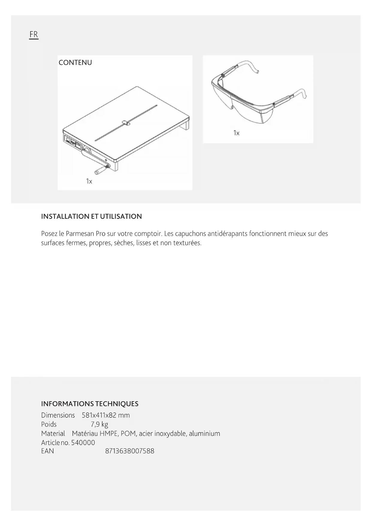 Posez le Parmesan Pro sur votre comptoir. Les capuchons antidérapants fonctionnent mieux sur des surfaces fermes, propres, sèches, lisses et non texturées. CONTENU INFORMATIONS TECHNIQUES Dimensions 581x411x82 mm Poids 7,9 kg Material Matériau HMPE, POM, acier inoxydable, aluminium Article no. 540000 EAN 8713638007588FR