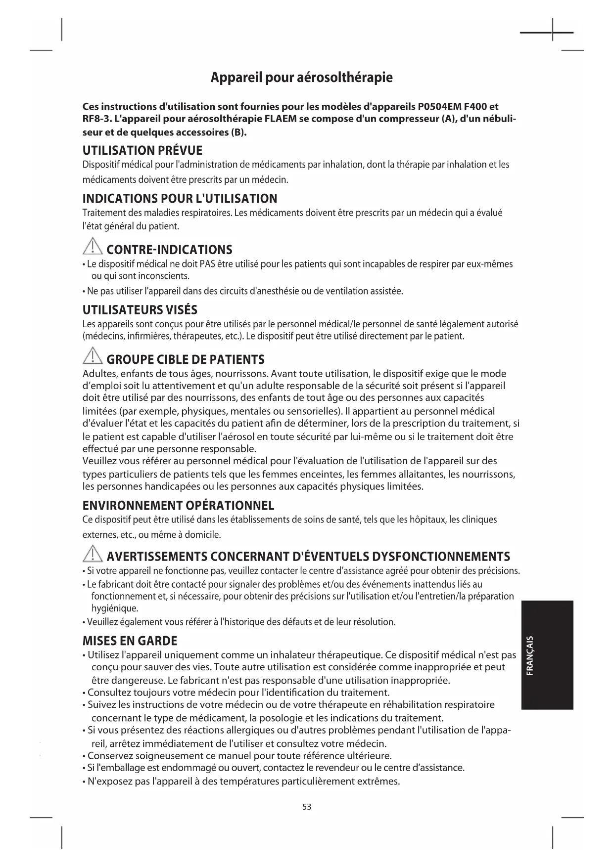 nly ts or Appareil pour aérosolthérapie Ces instructions d'utilisation sont fournies pour les modèles d'appareils P0504EM F400 et RF8-3. L'appareil pour aérosolthérapie FLAEM se compose d'un compresseur (A), d'un nébuli- seur et de quelques accessoires (B).