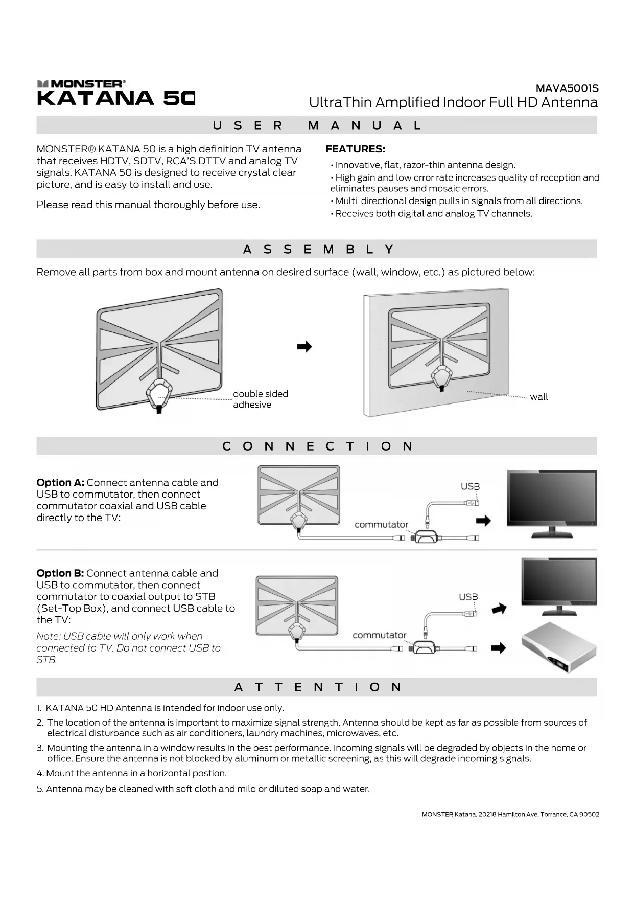 ASSEMBLAGE CONNEXION ATTENTION MONSTER® KATANA 50 est une antenne télé haute définition qui reçoit les signaux télé HDTV, SDTV, RCA DTTV et analogique. KATANA 50 est conçue pour recevoir une image cristalline et est facile à installer et à utiliser. Veuillez lire ce manuel attentivement avant l’utilisation. CARACTÉRISTIQUES :