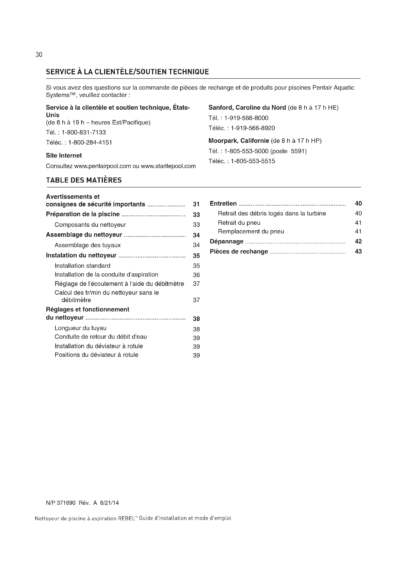 N/P 371690 Rév. A 8/21/14 Si vous avez des questions sur la commande de pièces de rechange et de produits pour piscines Pentair Aquatic Systems™, veuillez contacter :