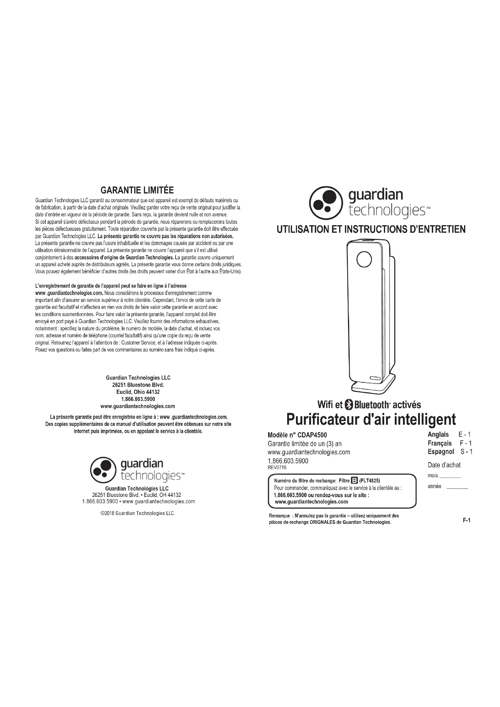 Anglais E - 1 Français F - 1 Espagnol S - 1 Date d’achat mois ________année ________©2016 Guardian Technologies LLCGuardian Technologies LLC26251 Bluestone Blvd. • Euclid, OH 441321.866.603.5900 • www.guardiantechnologies.comGuardian Technologies LLC26251 Bluestone Blvd.Euclid, Ohio 441321.866.603.5900www.guardiantechnologies.comLa présente garantie peut être enregistrée en ligne à : www .guardiantechnologies.com.Des copies supplémentaires de ce manuel d’utilisation peuvent être obtenues sur notre siteInternet puis imprimées, ou en appelant le service à la clientèle. Wifi et activés Remarque : N’annulez pas la garantie – utilisez uniquement des pièces de rechange ORIGNALES de Guardian Technologies.