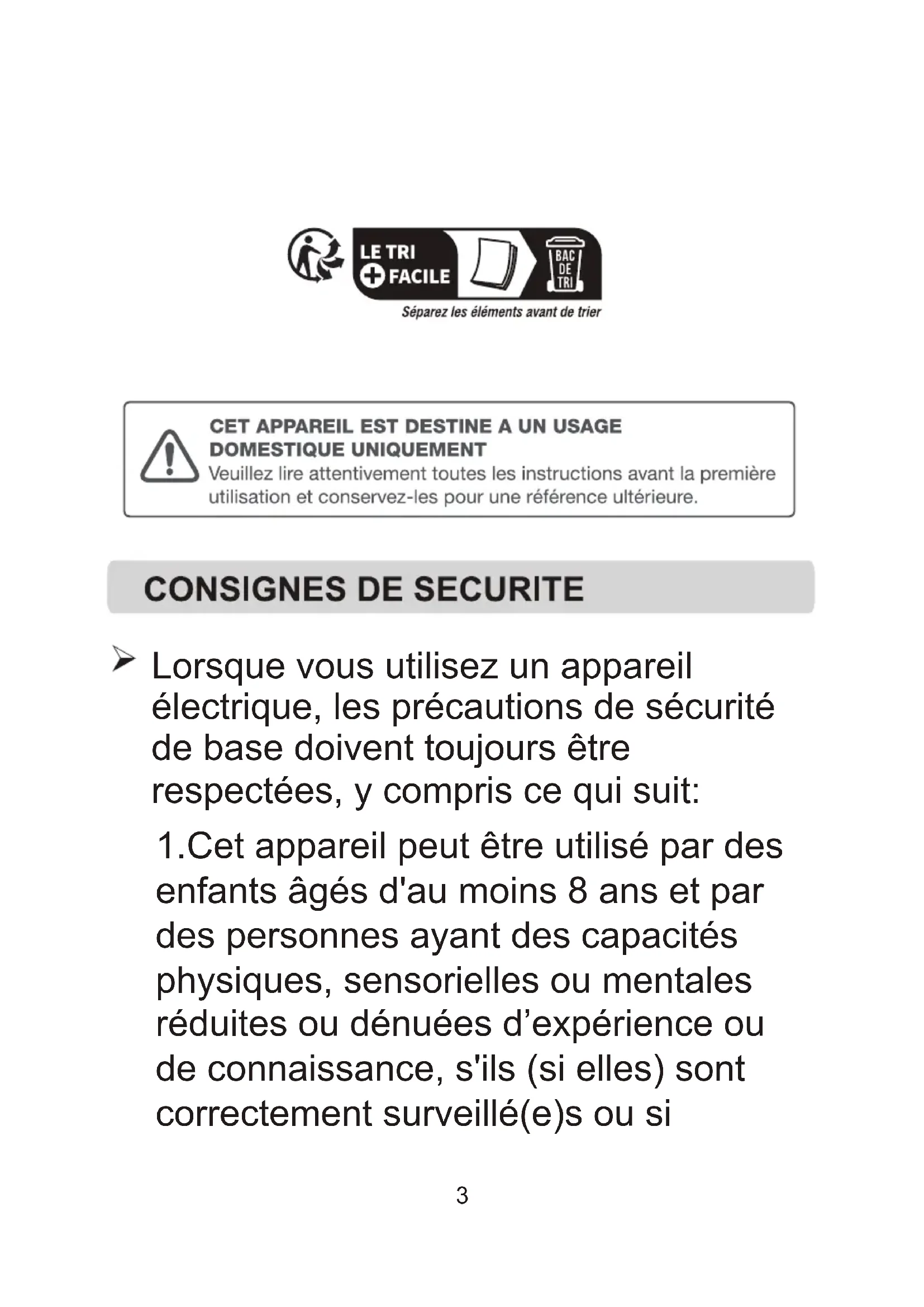 2Lorsque vous utilisez un appareil électrique, les précautions de sécurité de base doivent toujours être respectées, y compris ce qui suit: 1.Cet appareil peut être utilisé par des enfants âgés d'au moins 8 ans et par des personnes ayant des capacités physiques, sensorielles ou mentales réduites ou dénuées d’expérience ou de connaissance, s'ils (si elles) sont correctement surveillé(e)s ou si