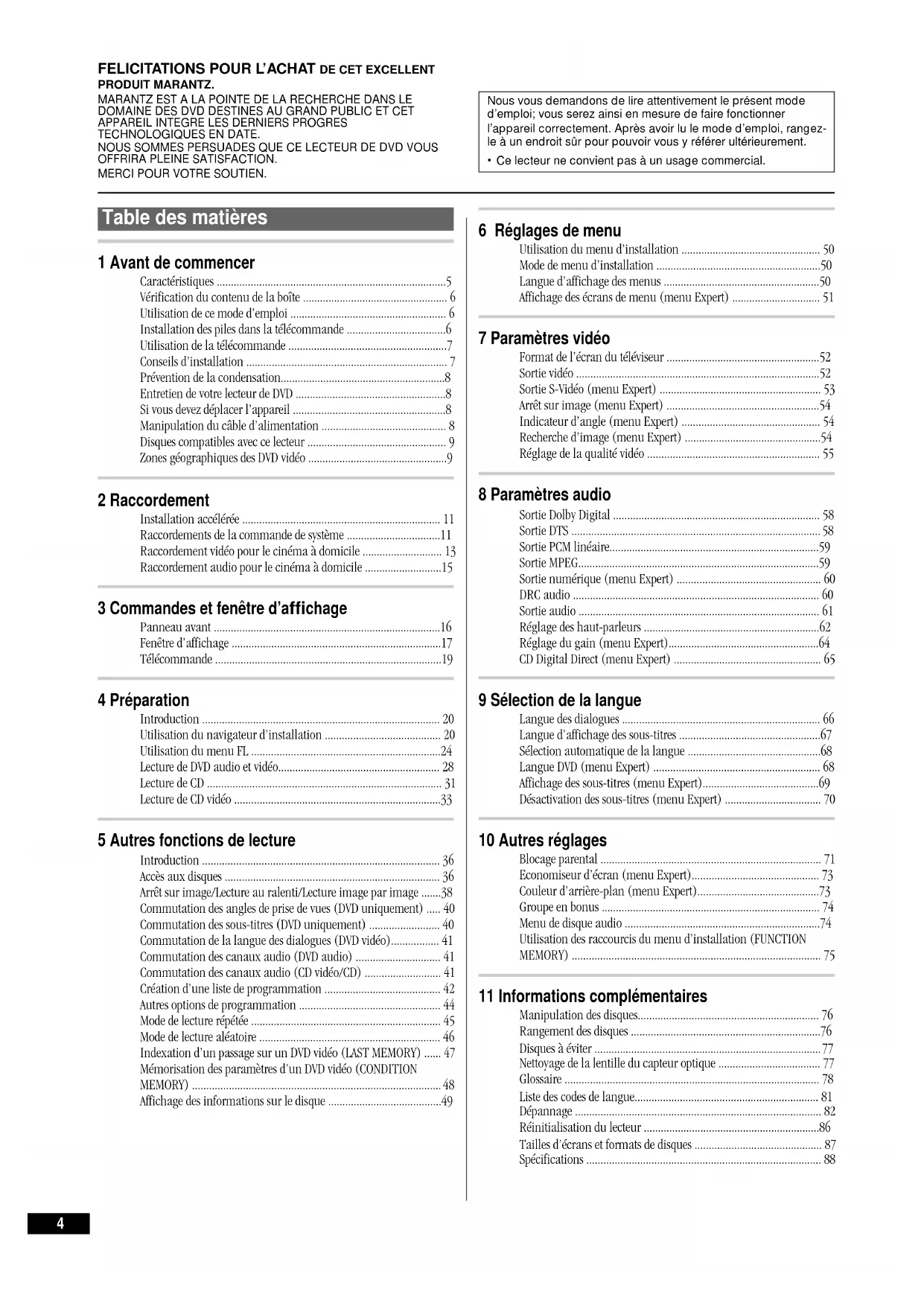 - Ce lecteur ne convient pas à un usage commercial. Table des matières 1 Avant de commencer Caractéristiques .................................................................................5 Vérification du contenu de la boîte ................................................... 6 Utilisation de ce mode d’emploi ....................................................... 6 Installation des piles dans la télécommande ...................................6 Utilisation de la télécommande ........................................................7 Conseils d’installation ....................................................................... 7 Prévention de la condensation..........................................................8 Entretien de votre lecteur de DVD .....................................................8 Si vous devez déplacer l’appareil ......................................................8 Manipulation du câble d’alimentation ............................................ 8 Disques compatibles avec ce lecteur ................................................. 9 Zones géographiques des DVD vidéo .................................................9 2 Raccordement Installation accélérée ...................................................................... 11 Raccordements de la commande de système .................................11 Raccordement vidéo pour le cinéma à domicile ............................ 13 Raccordement audio pour le cinéma à domicile ...........................15 3 Commandes et fenêtre d’affichage Panneau avant ................................................................................16 Fenêtre d’affichage ..........................................................................17 Télécommande ................................................................................19 4 Préparation Introduction .................................................................................... 20 Utilisation du navigateur d’installation ......................................... 20 Utilisation du menu FL ...................................................................24 Lecture de DVD audio et vidéo......................................................... 28 Lecture de CD ................................................................................... 31 Lecture de CD vidéo .........................................................................33 5 Autres fonctions de lecture Introduction .................................................................................... 36 Accès aux disques ............................................................................ 36 Arrêt sur image/Lecture au ralenti/Lecture image par image .......38 Commutation des angles de prise de vues (DVD uniquement) ..... 40 Commutation des sous-titres (DVD uniquement) ......................... 40 Commutation de la langue des dialogues (DVD vidéo)................. 41 Commutation des canaux audio (DVD audio) .............................. 41 Commutation des canaux audio (CD vidéo/CD) ........................... 41 Création d’une liste de programmation ......................................... 42 Autres options de programmation .................................................. 44 Mode de lecture répétée ................................................................... 45 Mode de lecture aléatoire ................................................................ 46 Indexation d’un passage sur un DVD vidéo (LAST MEMORY) ...... 47 Mémorisation des paramètres d’un DVD vidéo (CONDITION MEMORY) ........................................................................................48 Affichage des informations sur le disque ........................................49ENGLISH FRANÇAIS