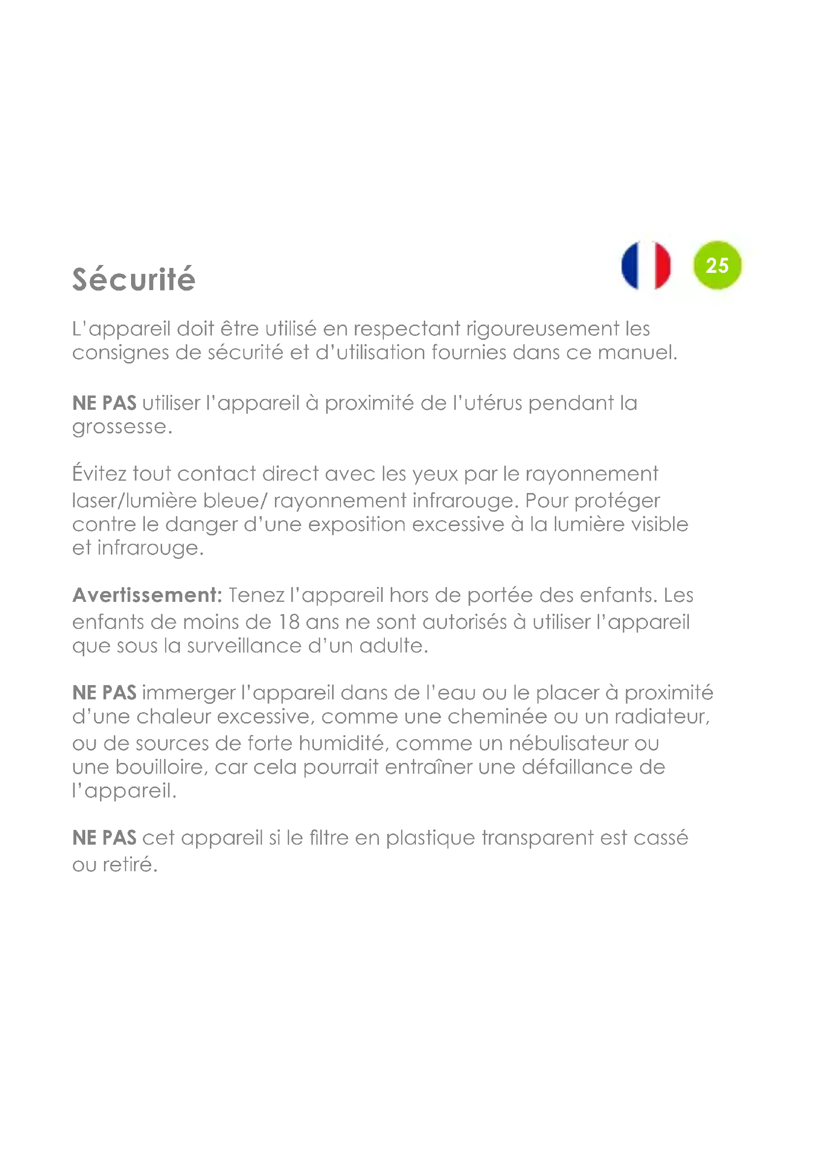 Il n’y a aucune pièce réparable par l’utilisateur. Aucune modication de cet équipement n’est autorisée. NE PAS l’appareil si vous êtes: Souffrant de coups de soleil. Sous soins médicaux pour des maladies impliquant une photosensibilité. Recevoir des médicaments photosensibilisants. Si vous ressentez des effets secondaires inattendus, tels que des démangeaisons, qui surviennent pendant les 48 premières heures d’utilisation de l’appareil, un avis médical doit être demandé avant une nouvelle exposition. L’appareil peut être utilisé par des enfants âgés de 8 ans et plus et des personnes ayant des capacités physiques, sensorielles ou mentales réduites ou un manque d’expérience et de connaissances s’ils ont reçu une supervision ou des instructions concernant l’utilisation en toute sécurité et comprennent les dangers impliqués. Les enfants ne doivent pas jouer avec l’appareil et ne doivent pas être laissés sans surveillance.