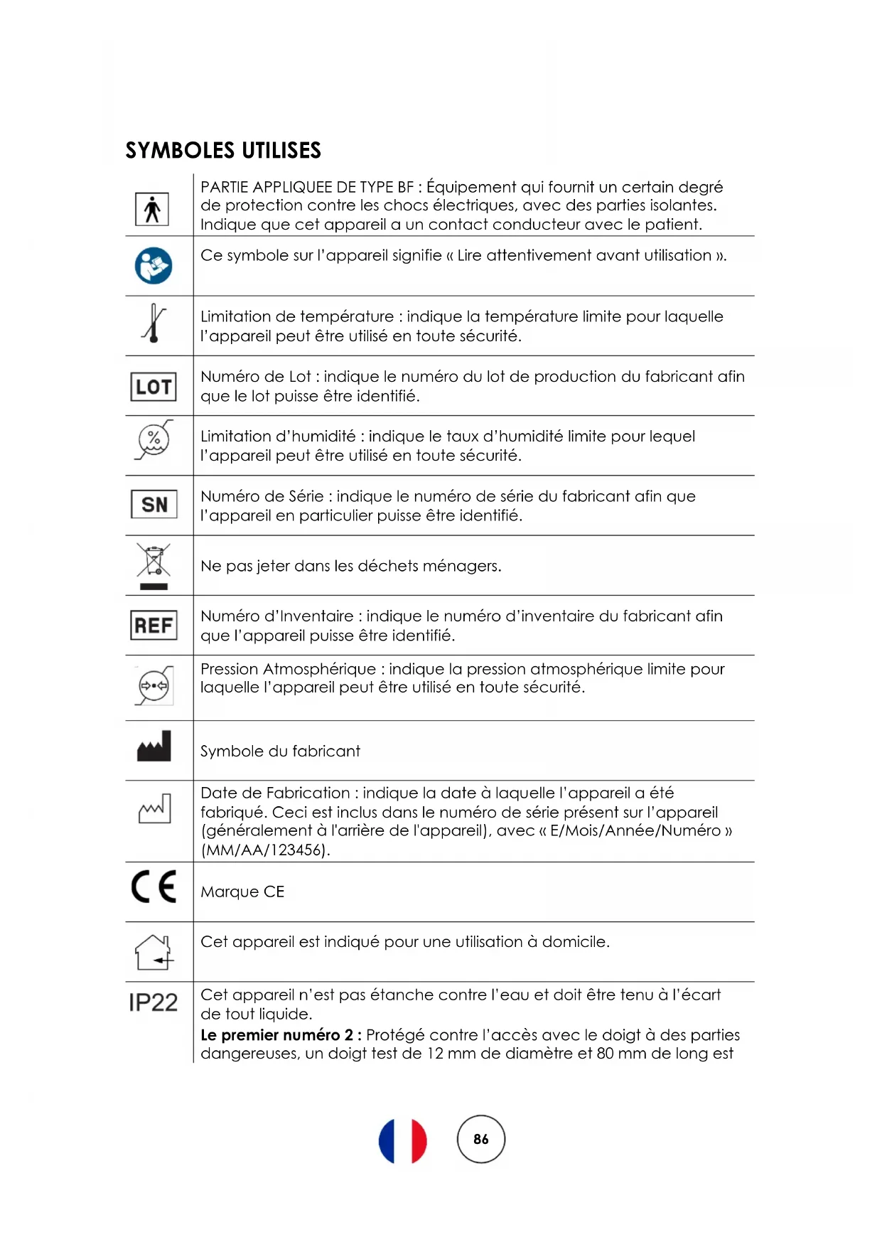 SYMBOLES UTILISES PARTIE APPLIQUEE DE TYPE BF : Équipement qui fournit un certain degré de protection contre les chocs électriques, avec des parties isolantes. Indique que cet appareil a un contact conducteur avec le patient.