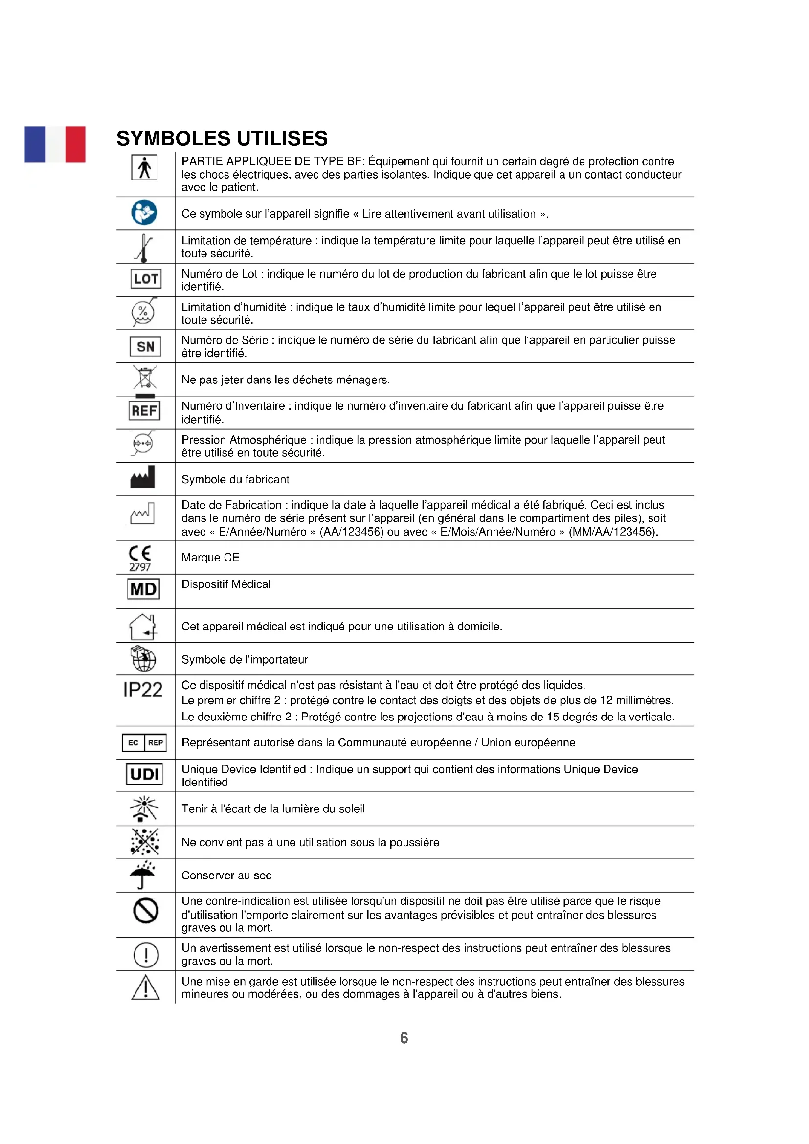 Date de Fabrication : indique la date à laquelle l’appareil médical a été fabriqué. Ceci est inclus dans le numéro de série présent sur l’appareil (en général dans le compartiment des piles), soit avec « E/Année/Numéro » (AA/123456) ou avec « E/Mois/Année/Numéro » (MM/AA/123456).