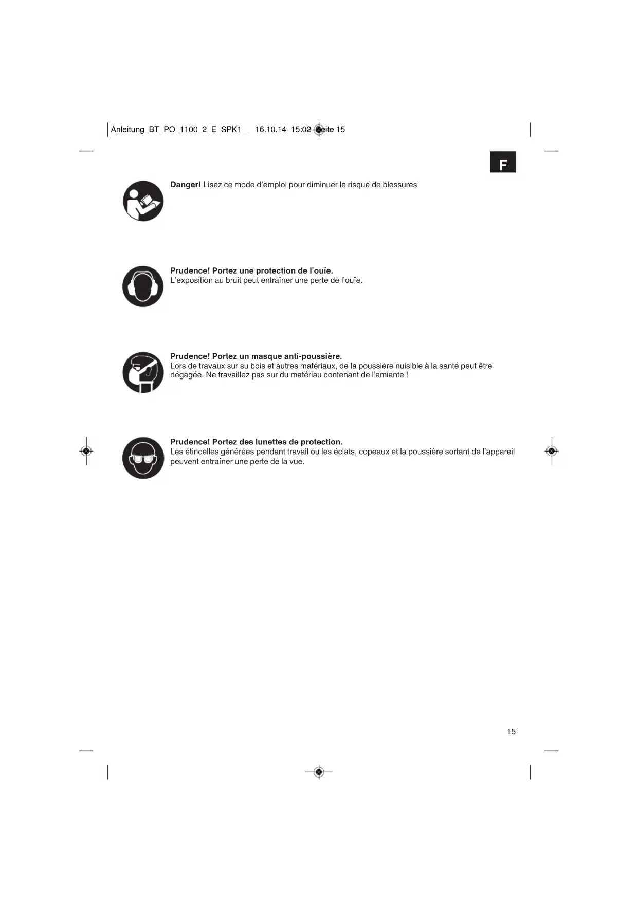 Danger! Lisez ce mode d’emploi pour diminuer le risque de blessures Prudence! Portez une protection de l’ouïe. L’exposition au bruit peut entraîner une perte de l’ouïe. Prudence! Portez un masque anti-poussière. Lors de travaux sur su bois et autres matériaux, de la poussière nuisible à la santé peut être dégagée. Ne travaillez pas sur du matériau contenant de l’amiante ! Prudence! Portez des lunettes de protection. Les étincelles générées pendant travail ou les éclats, copeaux et la poussière sortant de l’appareil peuvent entraîner une perte de la vue. Anleitung_BT_PO_1100_2_E_SPK1__ 16.10.14 15:02 Seite 15Danger! Lors de lʼutilisation dʼappareils, il faut respecter certaines mesures de sécurité afin dʼéviter des blessures et dommages. Veuillez donc lire attentivement ce mode dʼemploi. Conservez-le bien de façon à pouvoir disposer à tout moment de ces informations. Si lʼappareil doit être remis à dʼautres personnes, remettez-leur aussi ce mode dʼemploi. Nous déclinons toute responsabilité pour les accidents et dommages dus au non-respect de ce mode dʼemploi et des consignes de sécurité.
