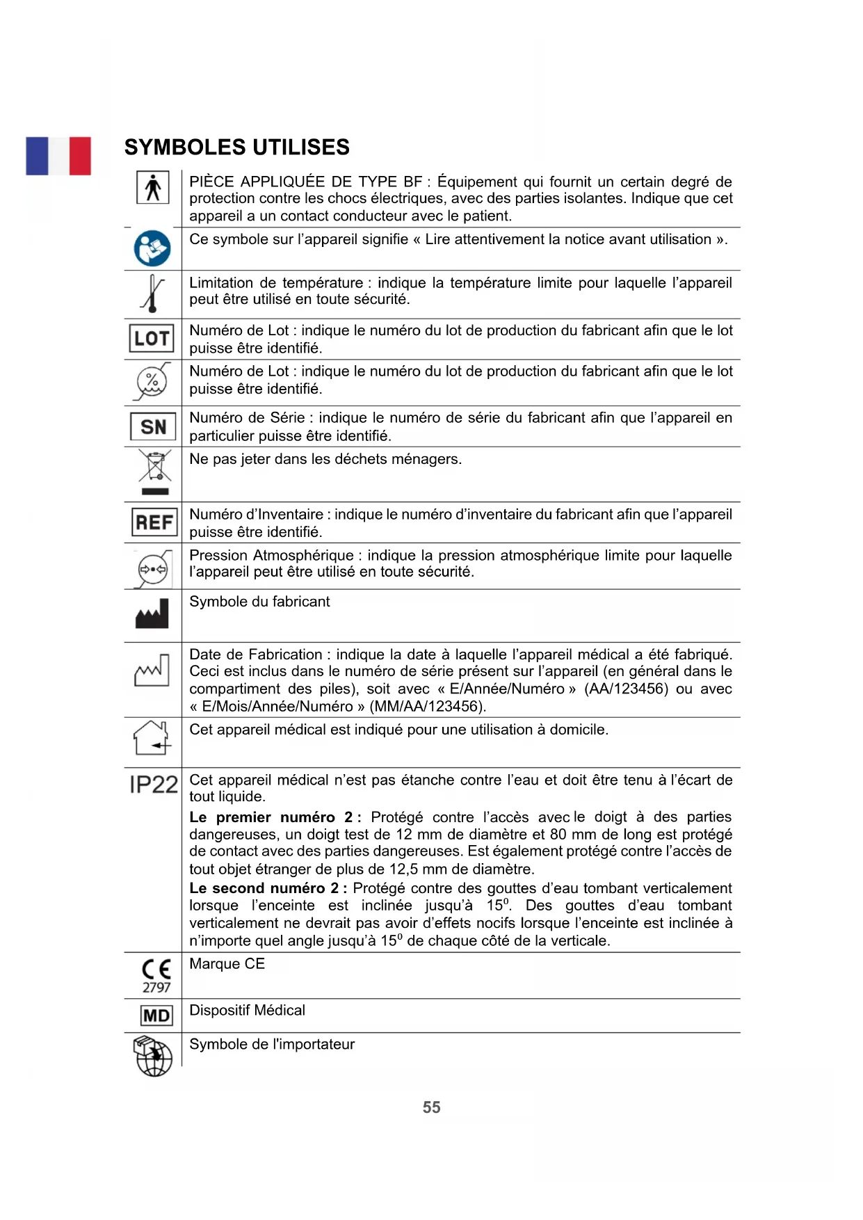 Stockage : Limite de températures : 5 à 40°C Humidité : 15 à 93 % HR non-condensé Pression atmosphérique : 70 kPa à 106 kPa Limite de températures : -25 à +70°C Humidité : Jusqu’à 93 % HR non-condensé Type BF Equipement assurant un degré de protection contre les chocs électriques avec des parties appliquées isolées. Ce symbole sur l’appareil signifie « Lire attentivement la notice avant utilisation ». IP22 Cet appareil médical n’est pas étanche contre l’eau et doit être tenu à l’écart de tout liquide.