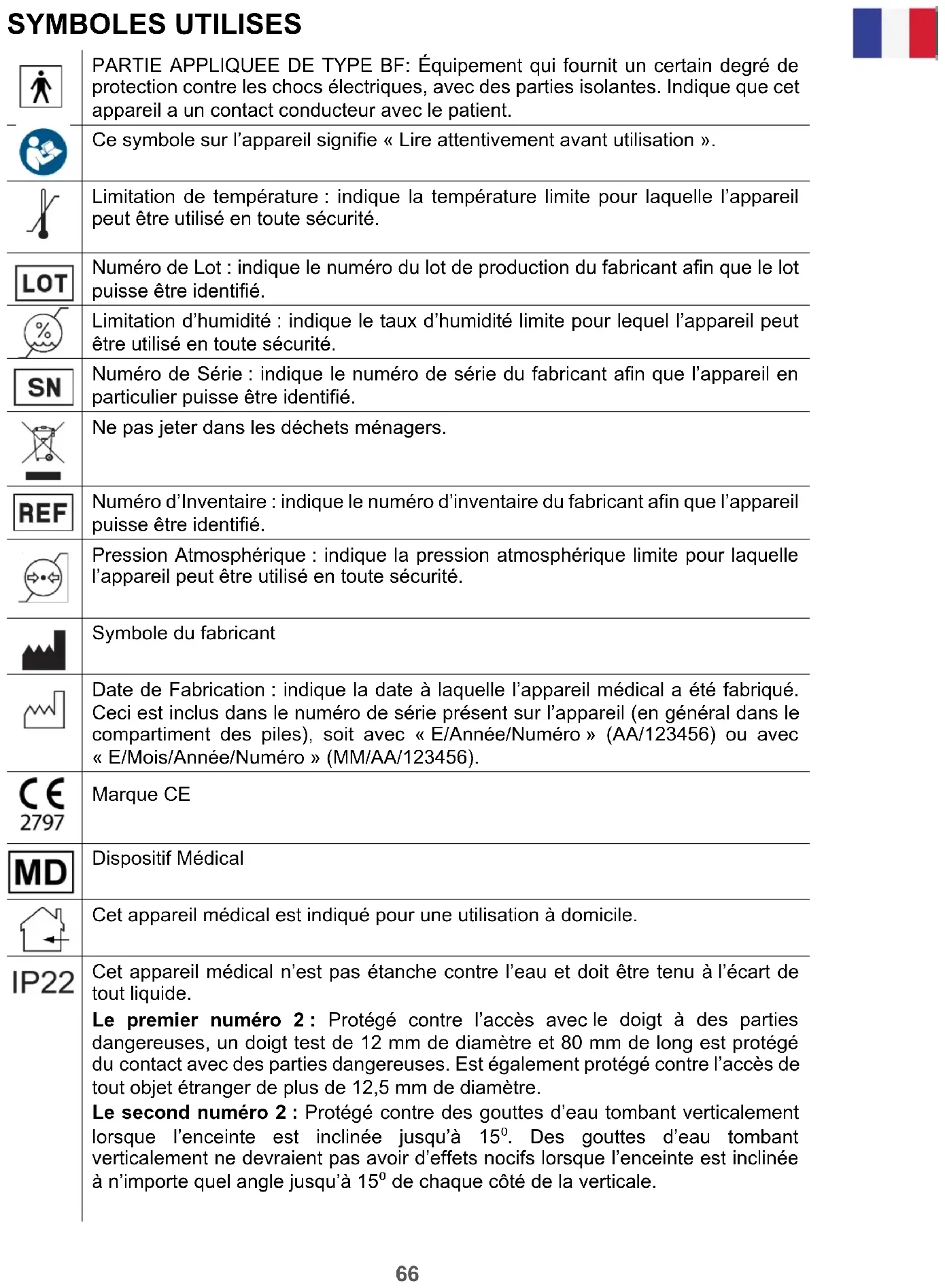 Equipement assurant un degré de protection contre les chocs électriques avec des parties appliquées isolées. Ce symbole sur l’appareil signifie « Lire attentivement la notice avant utilisation ». IP22 Cet appareil médical n’est pas étanche contre l’eau et doit être tenu à l’écart de tout liquide. Respecte les directives EU WEEE.