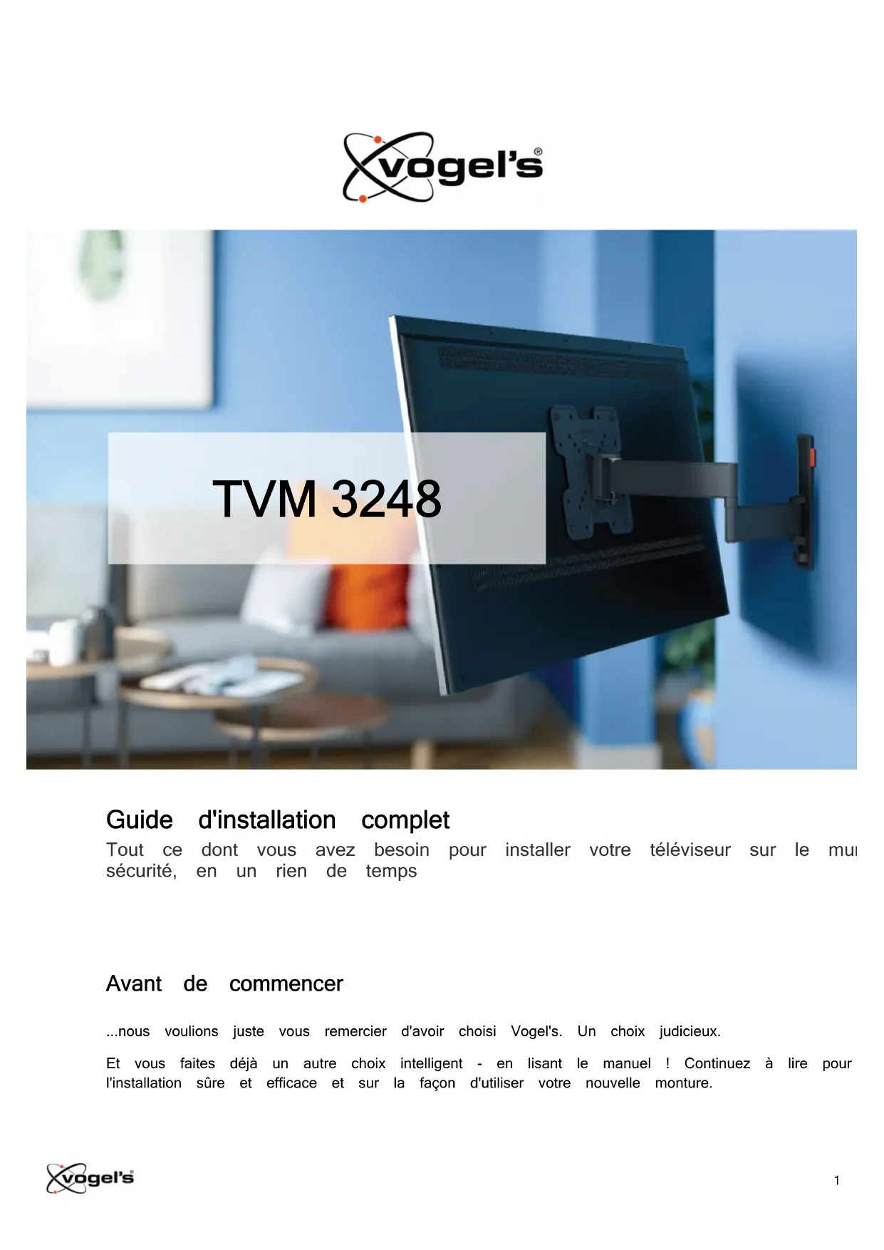 TVM 3248 Guide d'installation complet Tout ce dont vous avez besoin pour installer votre téléviseur sur le mur en toute sécurité, en un rien de temps Avant de commencer ...nous voulions juste vous remercier d'avoir choisi Vogel's. Un choix judicieux. Et vous faites déjà un autre choix intelligent - en lisant le manuel ! Continuez à lire pour tout savoir sur l'installation sûre et efficace et sur la façon d'utiliser votre nouvelle monture.2 Prenez soin de vous Attention Lisez toujours attentivement ces instructions de sécurité avant d'installer et d'utiliser ce produit. Il est strictement nécessaire de suivre ces instructions. Un montage incorrect et/ou une installation incorrecte peuvent vous mettre en danger, ainsi que votre téléviseur et votre famille. Ne prenez pas de risques... Lisez tout l Vogel's recommande que le montage et/ou l'installation de ce produit soient effectués par un expert dûment qualifié. l Vogel's ne peut être tenu responsable d'aucune blessure et/ou de dommages causés par une installation incorrecte. l Veuillez consulter le manuel de votre téléviseur et vous assurer que le poids et la taille du téléviseur sont conformes aux limites de poids et de taille maximales spécifiées pour ce produit, et que les boulons de montage du téléviseur utilisés sont d'une longueur et d'un diamètre appropriés. Notez que tous les accessoires de montage fournis ne sont pas nécessaires pour l'installation d'un seul téléviseur. l Les accessoires de fixation murale fournis sont exclusivement destinés à être installés sur des murs en briques pleines, en béton massif ou sur des colonnes en bois massif. l Tout matériau recouvrant le mur ne doit pas dépasser 3mm / 0,12 pouce. l Pour le montage sur des murs en d'autres matériaux, tels que des briques creuses, des panneaux de bois ou des plaques de plâtre, veuillez consulter votre installateur et/ou un fournisseur spécialisé. l Nettoyez le produit avec un chiffon sec non pelucheux. N'utilisez pas de détergents ou d'autres solvants pour nettoyer le produit. l Seul un personnel qualifié et certifié peut réparer le produit. N'utilisez que des pièces de rechange d'origine. L'utilisation d'autres pièces entraînera l'annulation de la garantie et pourrait entraîner des blessures. l Les altérations du produit et les modifications techniques ne sont pas autorisées. Cela annulera la garantie et pourrait entraîner des blessures. l Conservez toujours le produit dans un endroit sec et sûr, à une température comprise entre - 10°C et 50°C. l Manipulez et transportez le produit avec soin. l Reconditionnez le produit lorsque vous le transportez ou ne l'utilisez pas pendant une longue période.3 l Vous devez soulever votre téléviseur à deux. Ne soyez pas téméraire! Qu'y a-t-il dans votre boîte? l Il manque quelque chose? Assurez-vous que rien ne manque dans votre emballage: A. Support mural B. Adaptateur D. Instructions de sécurité E. Boulons pour les bandes de fixation sur les téléviseurs (voir le contenu ci-dessous) F. Espaceurs G. Rondelles Ø 18mm H. Vis