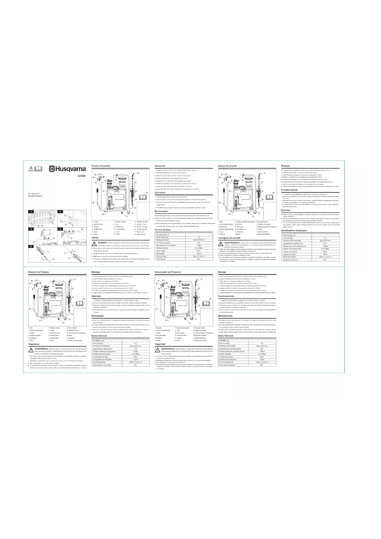 ouvrez le commutateur et commencez à pulvériser. 4. L’utilisateur peut choisir une buse réglable ou une buse à jet plat pour obtenir différents types de pulvérisation. Entretien Rincez la lance de pulvérisation, le tuyau et l’intérieur du réservoir à l’eau claire aprèschaque utilisation.Appliquez régulièrement du lubrifiant sur la rondelle d’étanchéité en feutre du tube intérieur pour assurer un mouvement fluide et éviter les fuites de liquide.Lors du remplacement de la rondelle d’étanchéité au fond du tube intérieur, démontez le tube intérieur, retirez ladite rondelle et remplacez-la par une nouvelle, puis ré-assemblez soigneusement. Spécifications techniques Poids net (kg) 3.5 36x21.5x57.5cm 0.9L 1.0Mpa0.2-0.3Mpa 60cm 120cm 20L 100cm x 3.5cm x 2Poids brut (kg)Dimensions de l’emballageCapacité de la chambre à air Pression max. de la chambre à air Pression de fonctionnement Longueur de la lanceLongueur du tuyau Sangle de transport Capacité du réservoir Segurança Montage 1. Insira o balancim (A) no orifício do fundo do reservatório (Fig.1).2. Insira a presilha (B) para balancim (A), (Fig.1).3. Fixe a biela (C) ao balancim (A), (Fig.2).4. Coloque a arruela (D) e o pino de travamento (E), (Fig.2).5. Coloque o fixador (F) na parte superior da câmara de ar (G), (Fig.3).6. Insira a biela (C) e fixe-a com o pino de travamento (E), (Fig.3).7. Encaixe a mangueira de pulverização (H) na câmara de ar (G), (Fig.4).8. Ligue o botão (I) à mangueira de pulverização (H) e à cana de pulverização (J), (Fig.5). Resumo do Produto 1. Bico2. Cana do pulverizador3. Gatilho4. Coador do gatilho5. Mangueira6. Cinta7. Presilha da alça8. Tampa9. Coador de água10. Câmara de ar11. Reservatório12. Base13. Pino dividido14. Fixador da alça15. Anel de fixação do balancim16. Biela17. Balancim18. Manual de instruções