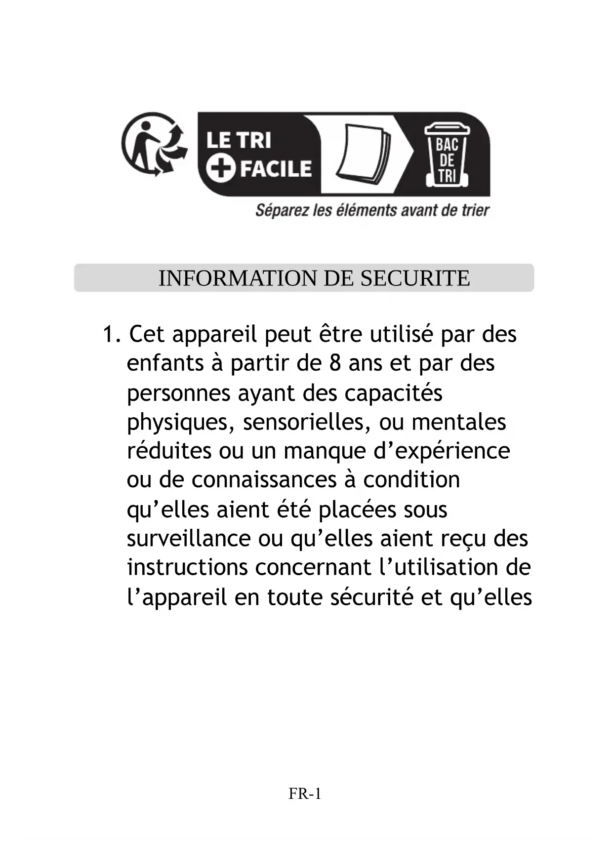 FR-1 comprennent les dangers encourus. Les enfants ne doivent pas jouer avec l’appareil. Le nettoyage et l’entretien par l’usager ne doivent pas être effectués par des enfants, sans surveillance.