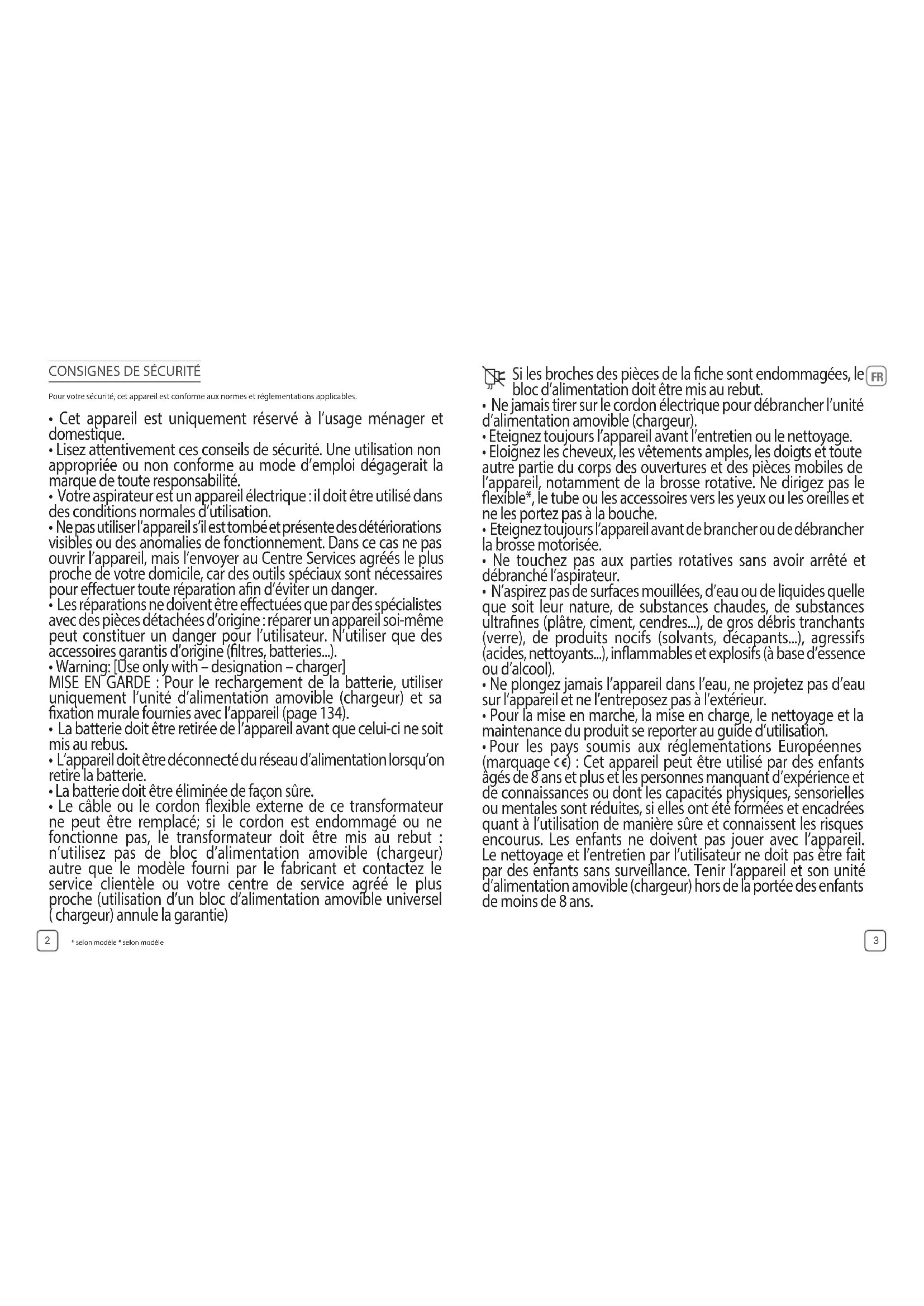 Le chargeur chaue Il s’agit d’un phénomène tout à fait normal. L’aspirateur peut rester connecté au chargeur en permanence sans aucun risque.Le chargeur est connecté mais votre appareil ne charge pas Le chargeur est mal connecté à l’appareil ou est défaillant. Vériez que le chargeur est bien connecté ou adressez-vous à un Centre de Services Agréés pour faire changer le chargeur.Votre appareil s’arrête pendant son fonctionnement et le(s) voyant(s) de charge clignote(ent) très rapidement Votre appareil est peut-être en surchaue. Arrêtez l’appareil et laisser l’appareil refroidir pendant au moins 1 heure.L’appareil s’est arrêté après que le voyant de charge ait clignoté L’appareil est déchargé. Rechargez l’aspirateur.L’électrobrosse fonctionne moins bien ou fait un bruit anormal La brosse rotative ou le exible sont obstrués.Arrêtez l’aspirateur et nettoyez-les.La brosse est usée.Adressez-vous à un Centre de Services Agréés pour faire changer la brosse.La courroie est usée.Adressez-vous à un Centre de Services Agréés pour faire changer la courroie.L’électrobrosse s’arrête en cours d’aspiration La sécurité thermique a fonctionné.Arrêtez l’aspirateur. Vériez qu’aucun élément ne gêne la rotation de la brosse, si c’est le cas retirez l’élément bloquant et nettoyez l’électrobrosse, puis remettez l’aspirateur en marche.Votre aspirateur aspire moins bien, fait du bruit, sie Le tube ou le exible sont partiellement bouchés. Débouchez-les.Le réceptacle à poussière est plein. Videz-le et nettoyez-le.Le bac à poussière est mal positionné. Replacez-le correctement. La tête d’aspiration est encrassée. Démontez l’électrobrosse et nettoyez-la.Le ltre de protection du moteur est saturé.Nettoyez-le.A la mise en charge de l’aspirateur, le(s) voyant(s) de charge clignote(nt) en rouge ou très rapidement.Ce n’est pas le bon chargeur ou celui-ci est défectueux.Adressez-vous à un Centre de Services Agréés pour faire changer le chargeur.La LED rouge du produit clignote pendant l’usageLa brosse de la tête d’aspiration est bloquée.Arrêtez l’aspiration et vériez qu’aucun élément ne bloque la rotation de la brosse.Température de la batterie est trop élevée.Laissez reposer le produit 30min. Si le problème persiste, changez la batterie.Les connecteurs du tube et/ou de la tête d’aspiration sont sales ou endommagés.Nettoyez à l’aide d’un chion les connecteurs du tube et de la tête d’aspiration.Le moteur d’aspiration est hors d’usage.Adressez-vous à un Centre de Services Agréés pour faire réparer votre appareil. Merci de conserver ce mode d’emploi.EN