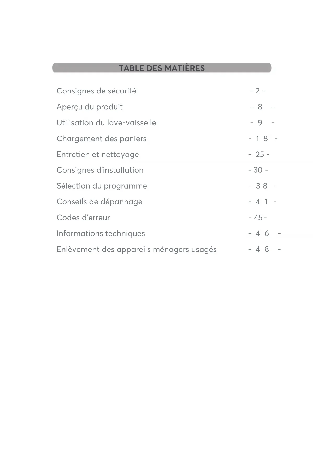 - 3 0 - - 3 8 - - 4 1 - - 4 5 - - 4 6 - - 4 8 -Consignes de sécurité Aperçu du produit Utilisation du lave-vaisselle Chargement des paniers Entretien et nettoyage Consignes d’installation Sélection du programme Conseils de dépannage Codes d’erreur Informations techniques Enlèvement des appareils ménagers usagés