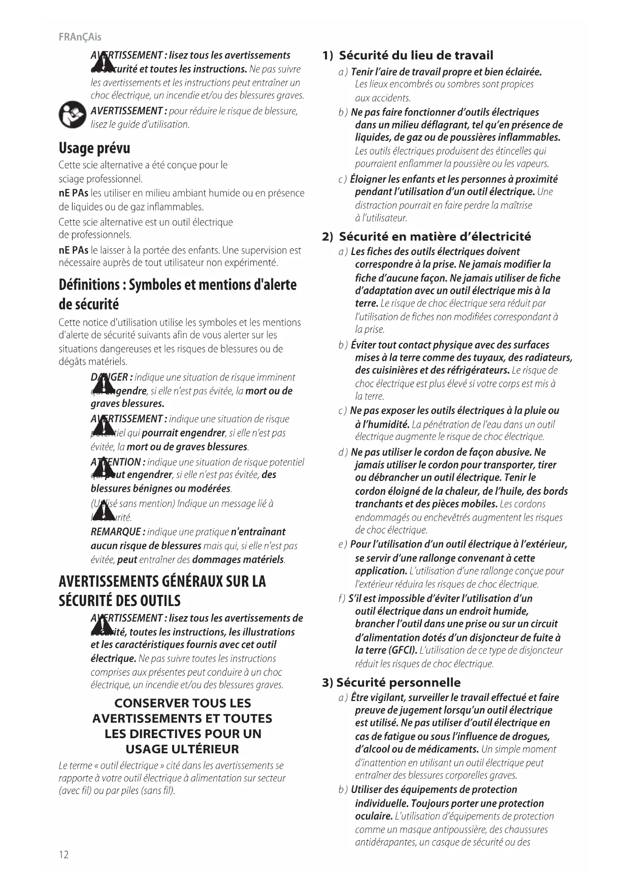 (Utilisé sans mention) Indique un message lié à lasécurité. REMARQUE: indique une pratique n'entraînant aucun risque de blessures mais qui, si elle n'est pas évitée, peut entraîner des dommagesmatériels. Usage prévu Cette scie alternative a été conçue pour le sciageprofessionnel. nE PAs les utiliser en milieu ambiant humide ou en présence de liquides ou de gazinflammables. Cette scie alternative est un outil électrique deprofessionnels. nE PAs le laisser à la portée des enfants. Une supervision est nécessaire auprès de tout utilisateur nonexpérimenté. Français (traduction de la notice d’instructions originale)
