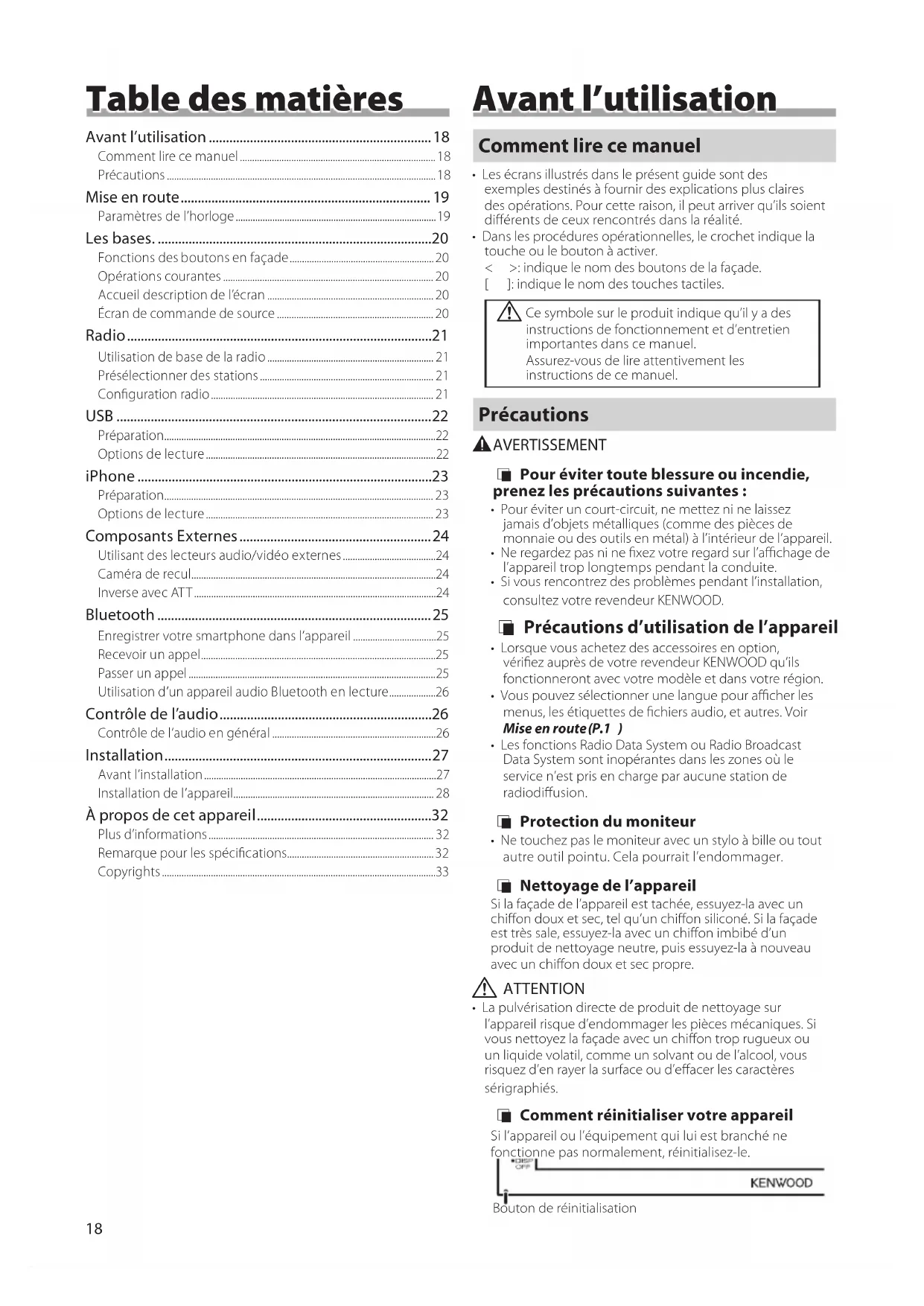 - Pour éviter un court-circuit, ne mettez ni ne laissez jamais d’objets métalliques (comme des pièces de monnaie ou des outils en métal) à l’intérieur de l’appareil.• Ne regardez pas ni ne xez votre regard sur l’achage de l’appareil trop longtemps pendant la conduite.• Si vous rencontrez des problèmes pendant l’installation, consultez votre revendeur KENWOOD. Ñ Précautions d’utilisation de l’appareil