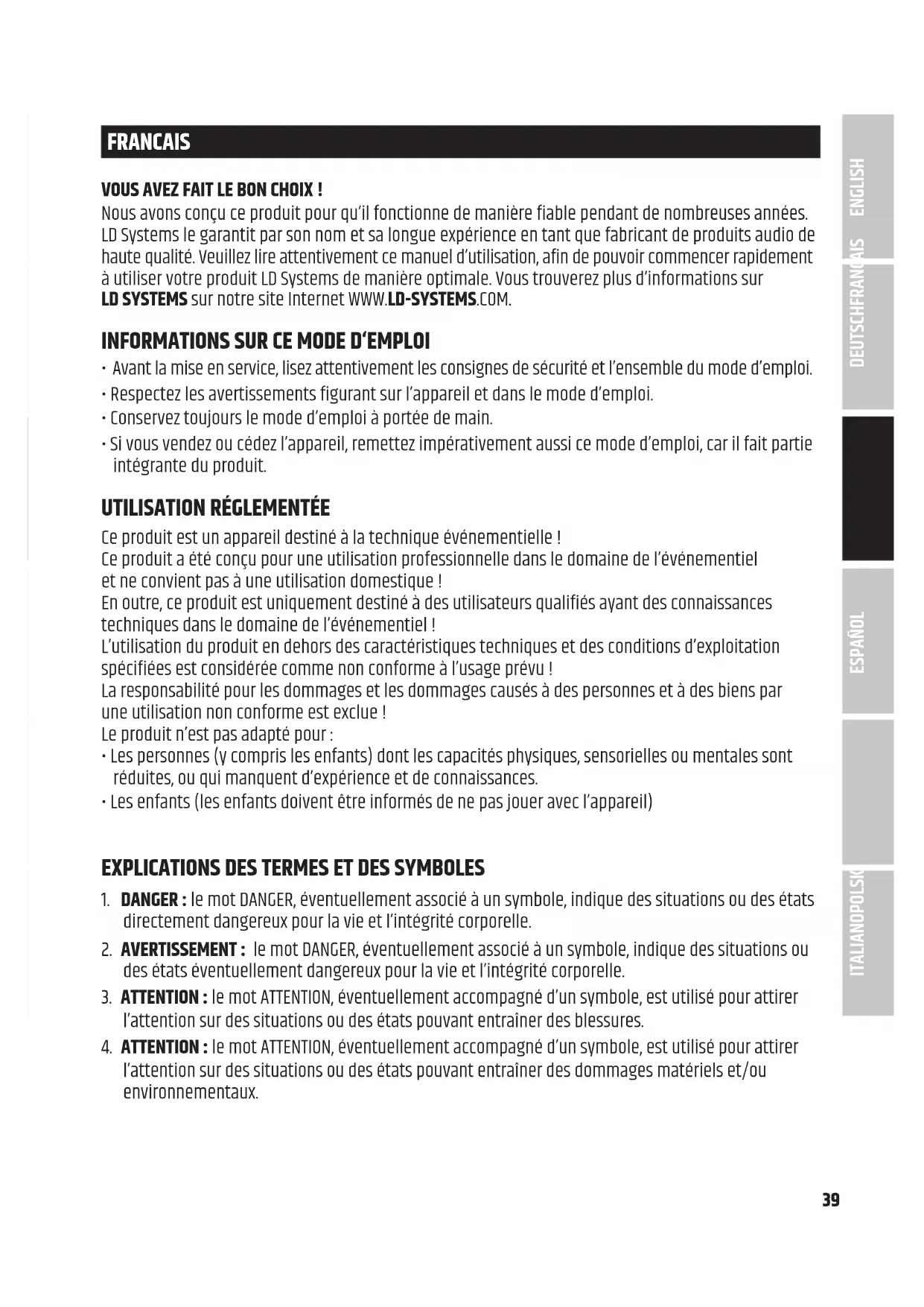 l’attention sur des situations ou des états pouvant entraîner des dommages matériels et/ou environnementaux. DEUTSCHFRANCAIS ESPAÑOL ENGLISH ITALIANO POLSKI40 Ce symbole indique les dangers qui peuvent provoquer un choc électrique. Ce symbole signale les endroits dangereux ou les situations dangereuses. Ce symbole indique les dangers liés aux surfaces chaudes. Ce symbole indique les dangers liés à un volume sonore élevé. Ce symbole signale des informations complémentaires sur l'utilisation du produit. Ce symbole indique un appareil qui ne contient aucune pièce remplaçable par l'utilisateur. Ce symbole indique un équipement électrique conçu principalement pour une utilisation en intérieur.