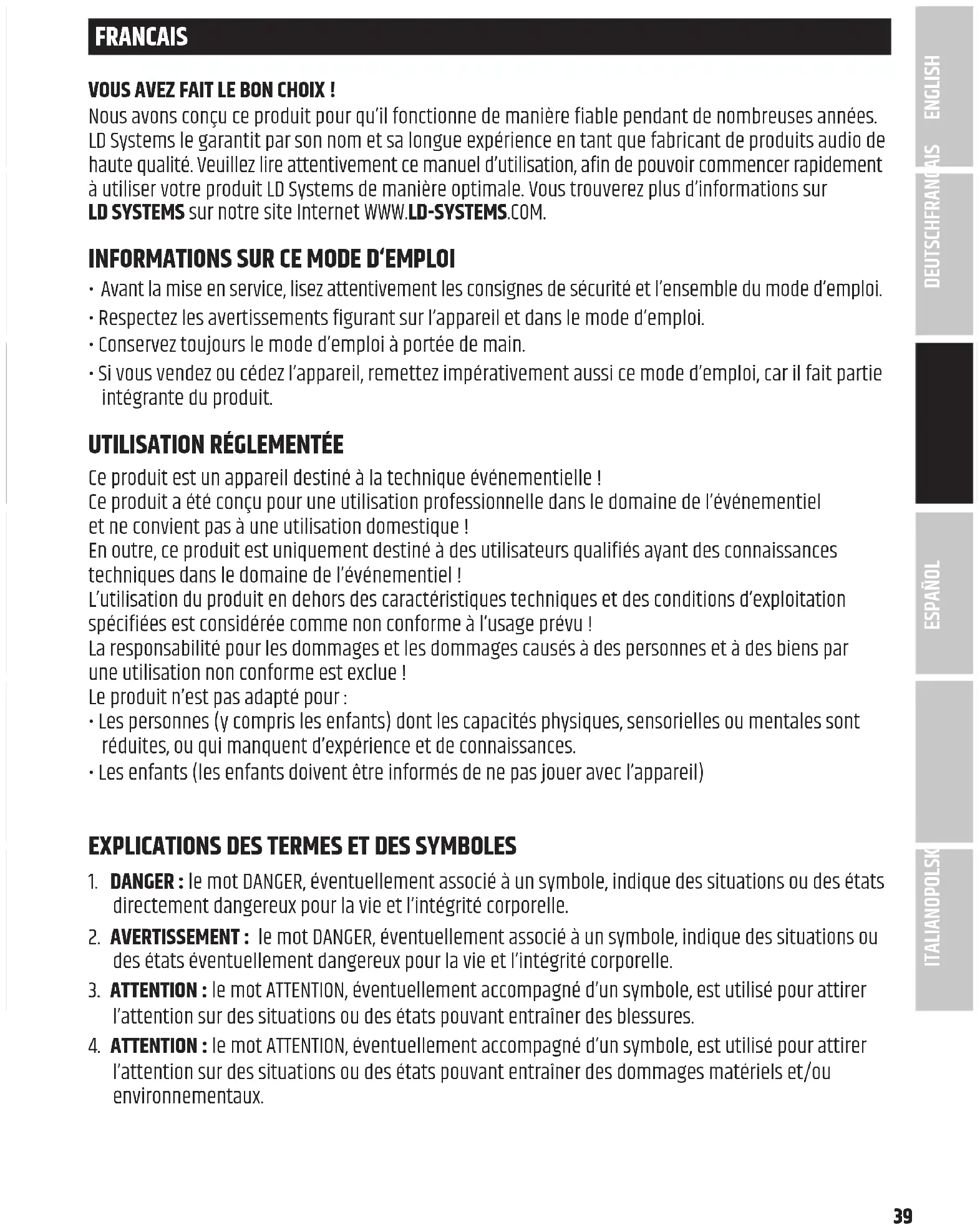 l’attention sur des situations ou des états pouvant entraîner des dommages matériels et/ou environnementaux. DEUTSCHFRANCAIS ESPAÑOL ENGLISH ITALIANO POLSKI40 Ce symbole indique les dangers qui peuvent provoquer un choc électrique. Ce symbole signale les endroits dangereux ou les situations dangereuses. Ce symbole indique les dangers liés aux surfaces chaudes. Ce symbole indique les dangers liés à un volume sonore élevé. Ce symbole signale des informations complémentaires sur l'utilisation du produit. Ce symbole indique un appareil qui ne contient aucune pièce remplaçable par l'utilisateur. Ce symbole indique un équipement électrique conçu principalement pour une utilisation en intérieur.