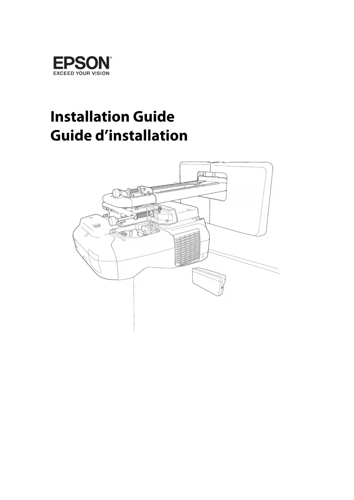 centre des étiquettes avec les pattes de l’unité tactile. I Posez le couvercle Fixez le couvercle des cadrans. Assurez-vous de serrer la vis dans la partie inférieure du couvercle. Si l’unité tactile se déplace hors position, utilisez la position des étiquettes pour déterminer où réinstaller l’unité tactile.136 9 Installation du boîtier de commande Vous devez avoir complété les étapes dans la section « Installation du projecteur » à la page 103 avant d’installer le boîtier de commande. Suivez les étapes ci-dessous pour installer le boîtier de commande et le connecter au projecteur. Vérifiez l’emplacement pour l’installation Le boîtier de commande doit être installé dans la zone indiquée dans le diagramme ci-dessous. Assurez-vous qu’il y a suffisamment d’espace autour du boîtier de commande. Assurez-vous de laisser assez d’espace à la gauche du boîtier de commande car le panneau supérieur s’ouvre vers la gauche. Le boîtier de commande doit seulement être connecté aux projecteurs BrightLink Pro 1410Wi/ 1420Wi/1430Wi. Ne connectez pas le boîtier de commande à d’autres modèles de projecteur. Avertissement 1,75 m68,9 po)0,9 m(35,4 po)0,7 m (27,6 po)0,35 m (13,8 po)0,25 m (9,8 po)1,0 m (39,3 po)1,5 m (59,0 po)2,0 m (78,7 po)2,0 m(78,7 po).( Image 60 poImage 100 po Zones d’émission infrarouge 50 mm (2 po)50 mm(2 po)50 mm (2 po)100 mm(3,9 po)137 Français A Retirez le cache-câbles B Fixez le boîtier de commande Fixez le boîtier de commande avec des vis M4 x 20 mm (x4) disponibles dans le commerce. ❏ Assurez-vous que les vis ne sont pas en angle.❏ Assurez-vous que le boîtier de commande est solidement fixé.❏ Ne fixez pas le boîtier de commande avec des aimants ou du ruban à deux côtés. Avertissement138 C Installez les piles ❏ Vérifiez si le boîtier de commande fonctionne correctement avant de le fixer avec les vis. ❏ Lorsque vous installez le boîtier de commande sur une table, fixez les pieds en plastique fournis (x4) à la base du boîtier de commande afin d’éviter qu’il puisse glisser. ❏ Utilisez deux piles au manganèse ou alcalines (recommandé). N’utilisez pas d’autres types de pile. Les piles rechargeables ne peuvent être utilisées. ❏ Afin d’alimenter le boîtier de commande avec le projecteur, branchez l’ensemble de câbles de la télécommande optionnel (modèle ELPKC28, numéro de pièce V12H005C28) au port Remote du projecteur et au port Remote du boîtier de commande. N’installez pas les piles. Avant de manipuler les piles, lisez les instructions de sécurité dans le Guide de l’utilisateur de votre projecteur. Mise en garde139 Français D Connectez les câbles du projecteur au boîtier de commande Pour effectuer les fonctions ci-dessous, vous devez brancher les câbles appropriés : E Apposez les autocollants de protection de port Couvrez les ports du boîtier de commande qui ne sont pas utilisés. F Fixez le cache-câbles Fonction du projecteur Câbles requis Projeter des images depuis une clé USB Câble USB 1 Enregistrer des données sur une clé USB Alimenter depuis le projecteur Ensemble de câbles de la télécommande (modèle ELPKC28; numéro de pièce V12H005C28) Projeter des images de l’ordinateur avec USB Display ou effectuer les fonctions de souris en utilisant Easy Interactive Function Câble USB 2 Câble USB 3 Imprimer une image projetée Câble USB 1 Câble USB 4 Câble USB 1Câble de la télécommandeCâble USB 2Câble USB 3Câble USB 4Clé UBS140 10Annexe Pour la fonction Easy Interactive Après avoir installé votre projecteur BrightLink (et l’unité tactile, si applicable), vous devez procéder au calibrage afin d’aligner les positions du curseur et du ou des crayons interactifs (et de votre doigt, si vous avez installé l’unité tactile). Consultez le Guide de l’utilisateur en ligne de votre projecteur et l’affiche Point de départ pour obtenir des informations détaillées. Pour utiliser le logiciel Easy Interactive Tools, vous devez d’abord installer le logiciel sur l’ordinateur. Les utilisateurs d’OS X doivent installer un pilote qui active le crayon ou l’interactivité par commande tactile. Les deux programmes sont inclus avec le projecteur BrightLink. Pour obtenir plus de détails, consultez le Guide de l’utilisateur en ligne ou sur l’un des sites Web suivants : É.-U. : epson.com/support/brightlinkdownloads Canada : epson.ca/support/brightlinkdownloads Fixation d’un câble de sécurité Si le projecteur doit être installé dans une pièce qui ne sera pas surveillée, vous pouvez utiliser un verrou de câble antivol disponible dans le commerce pour fixer le projecteur à un pilier ou autre objet pour éviter qu’il soit volé. Faites passer le câble du verrou antivol dans le point d’installation du câble de sécurité. Pour plus d’informations sur le verrouillage du verrou de câble, reportez-vous au Guide de l’utilisateur fourni avec le verrou. Lorsque l’installation du projecteur est terminée, assurez-vous de laisser la télécommande, les piles, les CD, le ou les crayons interactifs, les piles du crayon, le plateau des crayons et le chargeur des piles dans la pièce où le projecteur se trouve. Les accessoires inclus avec le projecteur varient selon le modèle et le pays. © 2014 Epson America, Inc., 4/14 CPD-41309