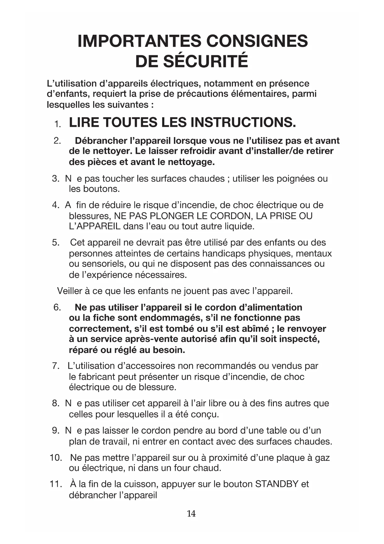 Une fois terminé, appuyer sur le bouton STANDBY puis débrancher l’appareil. Ouvrir les plaques et les laisser refroidir avant de les nettoyer. Ne jamais démonter l’appareil pour le nettoyer. Éliminer les miettes à l’aide d’un pinceau à pâtisserie et essuyer les plaques avec une serviette en papier ou un linge sec pour absorber l’huile. Au besoin, nettoyer les plaques à l’aide d’un linge humide pour prévenir les taches et les accumulations de résidus d’huile et éviter que la pâte ne colle aux plaques. Important: laisser les plaques refroidir avant de les nettoyer. Si des aliments ont adhéré plaques, verser un peu d’huile dessus et attendre 5 minutes ; cela détrempera les aliments séchés et facilitera le nettoyage. Essuyer le boîtier de l’appareil à l’aide d’un linge doux et sec. Ne pas utiliser de nettoyants abrasifs ou de tampons à récurer. NE JAMAIS PLONGER LE CORDON, LA PRISE OU L’APPAREIL DANS L’EAU OU TOUT AUTRE LIQUIDE. Toute autre opération d’entretien ou de réparation doit être effectuée par un centre de réparation agréé.19