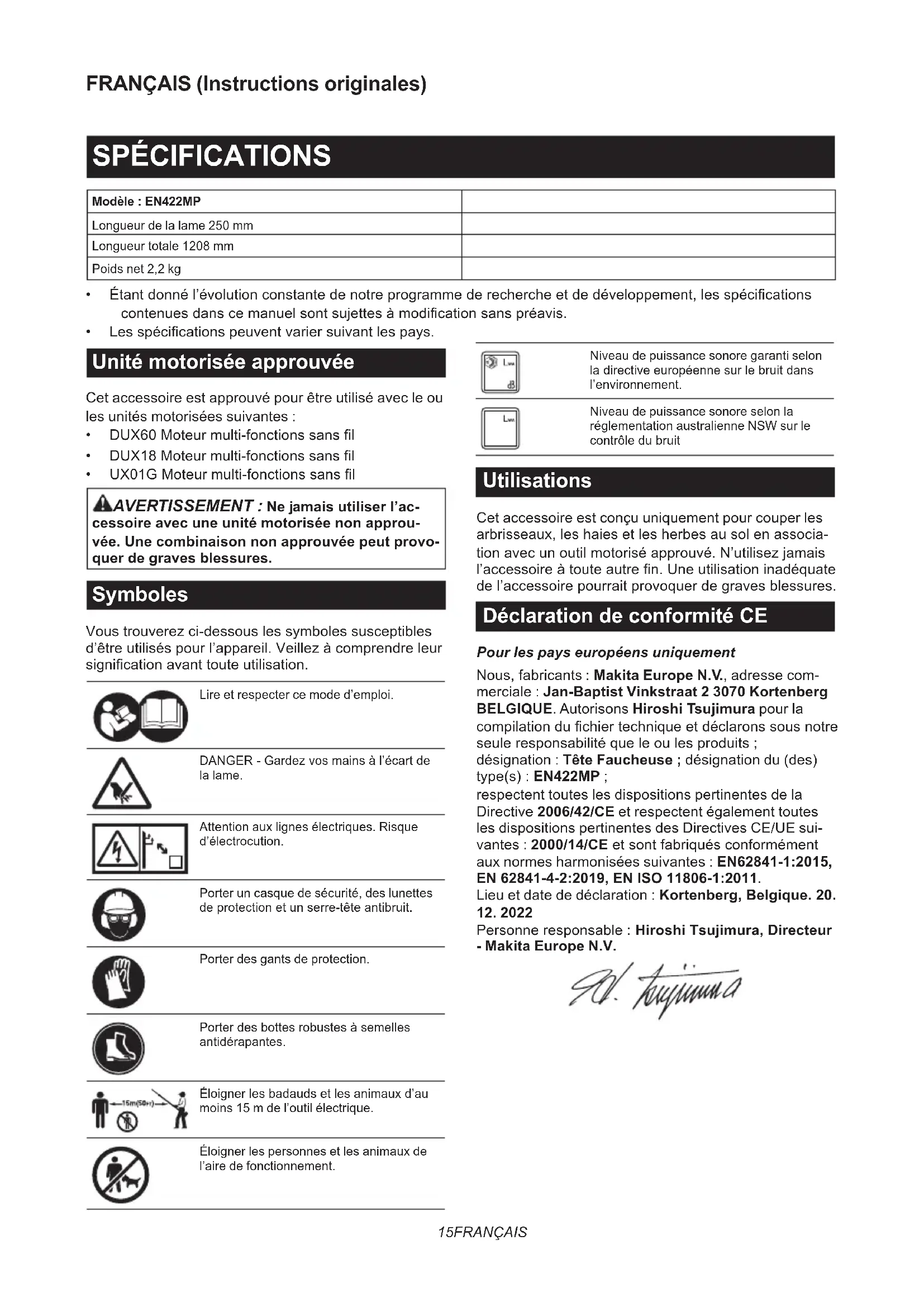 cessoire avec une unité motorisée non approu- vée. Une combinaison non approuvée peut provo- quer de graves blessures. Symboles Voustrouverezci-dessouslessymbolessusceptibles d’êtreutiliséspourl’appareil.Veillezàcomprendreleur signicationavanttouteutilisation. Lire et respecter ce mode d’emploi. DANGER-Gardezvosmainsàl’écartde la lame. Attention aux lignes électriques. Risque d’électrocution. Porter un casque de sécurité, des lunettes deprotectionetunserre-têteantibruit. Porter des gants de protection. Porterdesbottesrobustesàsemelles antidérapantes. Éloignerlesbadaudsetlesanimauxd’au moins 15 m de l’outil électrique. Éloigner les personnes et les animaux de l’aire de fonctionnement. Niveau de puissance sonore garanti selon ladirectiveeuropéennesurlebruitdans l’environnement. Niveau de puissance sonore selon la réglementation australienne NSW sur le contrôledubruit Utilisations Cet accessoire est conçu uniquement pour couper les arbrisseaux,leshaiesetlesherbesausolenassocia- tionavecunoutilmotoriséapprouvé.N’utilisezjamais l’accessoireàtouteautren.Uneutilisationinadéquate del’accessoirepourraitprovoquerdegravesblessures. Déclaration de conformité CE Pour les pays européens uniquement Nous,fabricants:Makita Europe N.V., adresse com- merciale : Jan-Baptist Vinkstraat 2 3070 Kortenberg BELGIQUE. Autorisons Hiroshi Tsujimura pour la compilationduchiertechniqueetdéclaronssousnotre seuleresponsabilitéqueleoulesproduits; désignation : Tête Faucheuse ; désignation du (des) type(s):EN422MP; respectent toutes les dispositions pertinentes de la Directive 2006/42/CE et respectent également toutes les dispositions pertinentes des Directives CE/UE sui- vantes : 2000/14/CEetsontfabriquésconformément aux normes harmonisées suivantes : EN62841-1:2015, EN 62841-4-2:2019, EN ISO 11806-1:2011. Lieu et date de déclaration : Kortenberg, Belgique. 20.