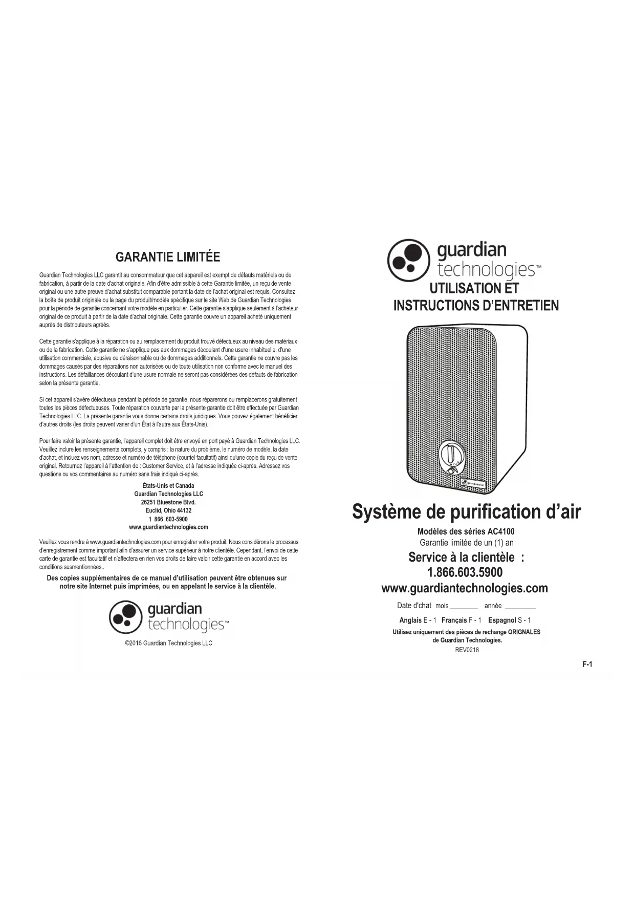 E-8 E-9Système de purification d’air Modèles des séries AC4100 Garantie limitée de un (1) an Anglais E - 1 Français F - 1 Espagnol S - 1 Date d'chat mois ________ année _________ Service à la clientèle: