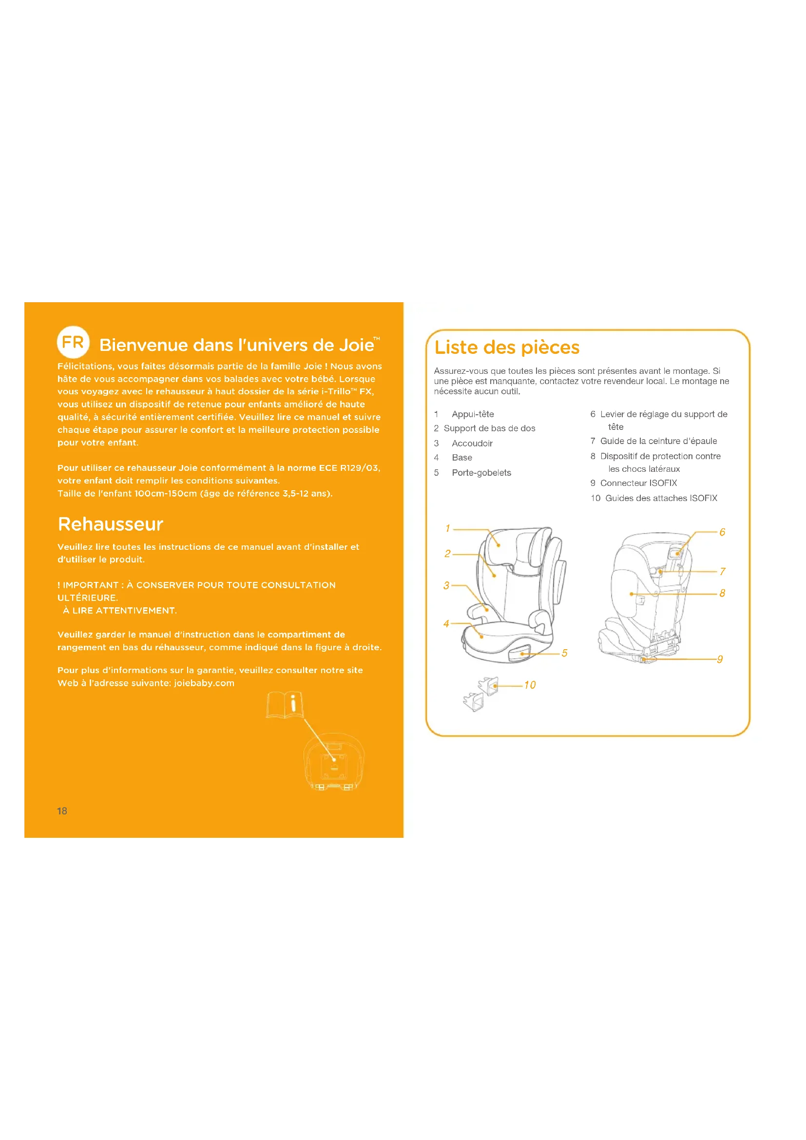 Félicitations, vous faites désormais partie de la famille Joie ! Nous avons hâte de vous accompagner dans vos balades avec votre bébé. Lorsque vous voyagez avec le rehausseur à haut dossier de la série i-Trillo™ FX, vous utilisez un dispositif de retenue pour enfants amélioré de haute qualité, à sécurité entièrement certifiée. Veuillez lire ce manuel et suivre chaque étape pour assurer le confort et la meilleure protection possible pour votre enfant.Pour utiliser ce rehausseur Joie conformément à la norme ECE R129/03, votre enfant doit remplir les conditions suivantes.Taille de l'enfant 100cm-150cm (âge de référence 3,5-12 ans). Rehausseur Veuillez lire toutes les instructions de ce manuel avant d'installer et d'utiliser le produit.! IMPORTANT : À CONSERVER POUR TOUTE CONSULTATION ULTÉRIEURE. À LIRE ATTENTIVEMENT.Veuillez garder le manuel d’instruction dans le compartiment de rangement en bas du réhausseur, comme indiqué dans la figure à droite.Pour plus d’informations sur la garantie, veuillez consulter notre site Web à l’adresse suivante: joiebaby.com