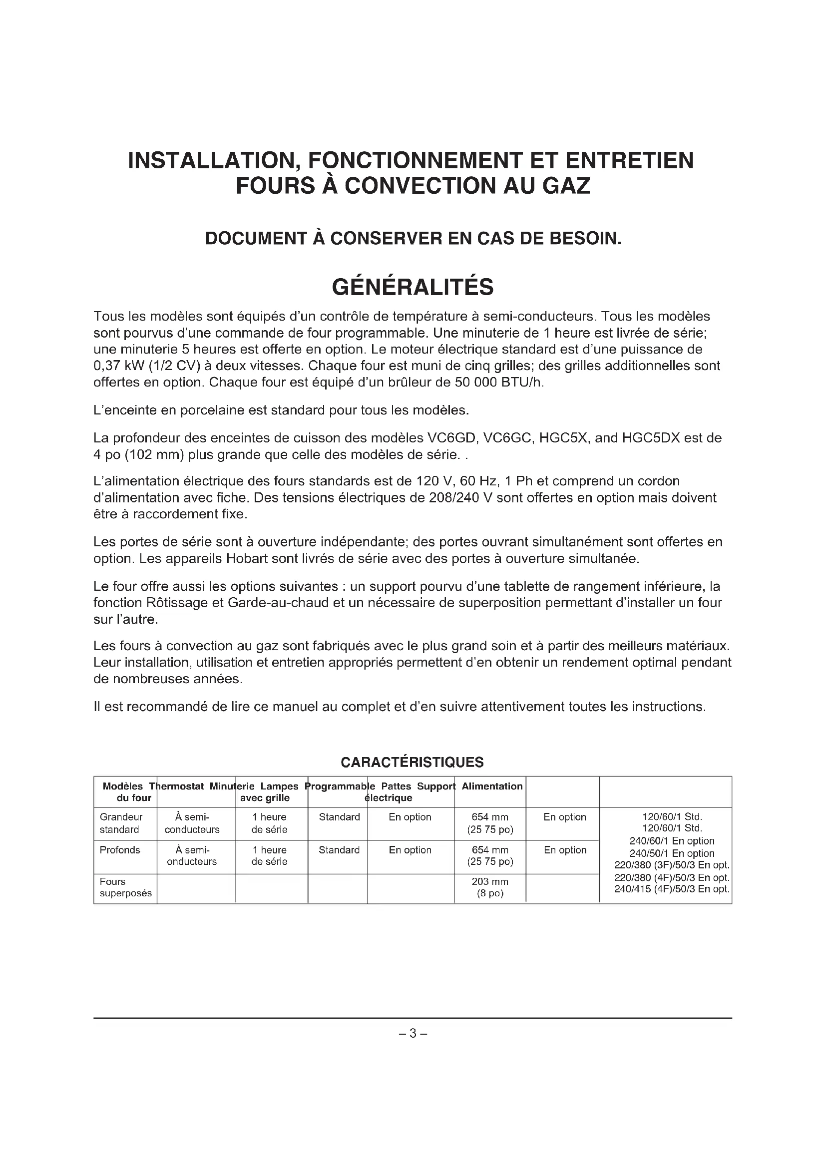 Tous les modèles sont équipés d’un contrôle de température à semi-conducteurs. Tous les modèles sont pourvus d’une commande de four programmable. Une minuterie de 1 heure est livrée de série; une minuterie 5 heures est offerte en option. Le moteur électrique standard est d’une puissance de 0,37 kW (1/2 CV) à deux vitesses. Chaque four est muni de cinq grilles; des grilles additionnelles sont offertes en option. Chaque four est équipé d’un brûleur de 50 000 BTU/h. L’enceinte en porcelaine est standard pour tous les modèles. La profondeur des enceintes de cuisson des modèles VC6GD, VC6GC, HGC5X, and HGC5DX est de 4 po (102 mm) plus grande que celle des modèles de série. . L’alimentation électrique des fours standards est de 120 V, 60 Hz, 1 Ph et comprend un cordon d’alimentation avec fiche. Des tensions électriques de 208/240 V sont offertes en option mais doivent être à raccordement fixe. Les portes de série sont à ouverture indépendante; des portes ouvrant simultanément sont offertes en option. Les appareils Hobart sont livrés de série avec des portes à ouverture simultanée. Le four offre aussi les options suivantes : un support pourvu d’une tablette de rangement inférieure, la fonction Rôtissage et Garde-au-chaud et un nécessaire de superposition permettant d’installer un four sur l’autre. Les fours à convection au gaz sont fabriqués avec le plus grand soin et à partir des meilleurs matériaux. Leur installation, utilisation et entretien appropriés permettent d’en obtenir un rendement optimal pendant de nombreuses années. Il est recommandé de lire ce manuel au complet et d’en suivre attentivement toutes les instructions. Modèles Thermostat Minuterie Lampes Programmable Pattes Support Alimentation du four avec grille électrique Grandeur À semi- 1 heure Standard En option 654 mm En option standard conducteurs de série (25 75 po) Profonds À semi- 1 heure Standard En option 654 mm En option onducteurs de série (25 75 po) Fours 203 mm superposés (8 po) CARACTÉRISTIQUES 120/60/1 Std. 120/60/1 Std. 240/60/1 En option 240/50/1 En option 220/380 (3F)/50/3 En opt. 220/380 (4F)/50/3 En opt. 240/415 (4F)/50/3 En opt.– 4 – INSTALLATION Avant de procéder à l’installation, s’assurer que l’alimentation électrique de l’immeuble et le type de gaz (naturel ou propane) correspondent aux spécifications de la plaque signalétique de l’appareil située derrière le panneau de garnissage supérieur en avant de l’appareil. Si elles ne correspondent pas, ne pas installer l’appareil. Communiquer avec votre représentant ou la compagnie Vulcan-Hart immédiatement. DÉBALLAGE Avant de quitter l’usine, cet appareil a été inspecté soigneusement. Le transporteur est entièrement responsable de la livraison de l’appareil. Immédiatement après l’avoir déballé, vérifier s’il n’a pas été endommagé lors du transport. En cas de dommages, conserver le matériel d’emballage et aviser le transporteur dans les 15 jours suivant la date de réception. Déballer l’appareil avec soin et l’installer dans un endroit suffisamment dégagé pour assurer un bon fonctionnement. Ne pas soulever le four par les portes ou les poignées. EMPLACEMENT Aucune substance combustible ne doit se trouver à proximité de l’appareil. Laisser un dégagement d’au moins 25 mm (1 po) du côté gauche de l’appareil, de 51 mm (2 po) du côté droit et de 0 mm (0 po) à l’arrière. Laisser un dégagement minimal de toute construction non combustible de 0 mm du côté gauche, de 0 mm (0 po) du côté droit et de 0 mm (0 po) à l’arrière. Le four peut être installé sur un plancher combustible. Installer le four dans un endroit suffisamment dégagé pour en faciliter l’utilisation et l’entretien. Le côté droit des fours à commande à semi-conducteurs et numérique doit être éloigné d’une flamme nue à une distance de 457 mm (18 po). Installer le four de manière à ne pas obstruer l’air nécessaire à la combustion et à la ventilation. Observer un dégagement suffisant autour des ouvertures d’approvisionnement d’air de la chambre de combustion. S’assurer d’une ventilation suffisante dans la pièce pour permettre la combustion des gaz dans les brûleurs du four. Ne pas laisser des ventilateurs souffler directement dans le four. Si possible, éviter d’ouvrir les fenêtres près du four. Éviter tout type de ventilateur mural pouvant créer des courants d’air contraires dans la pièce.