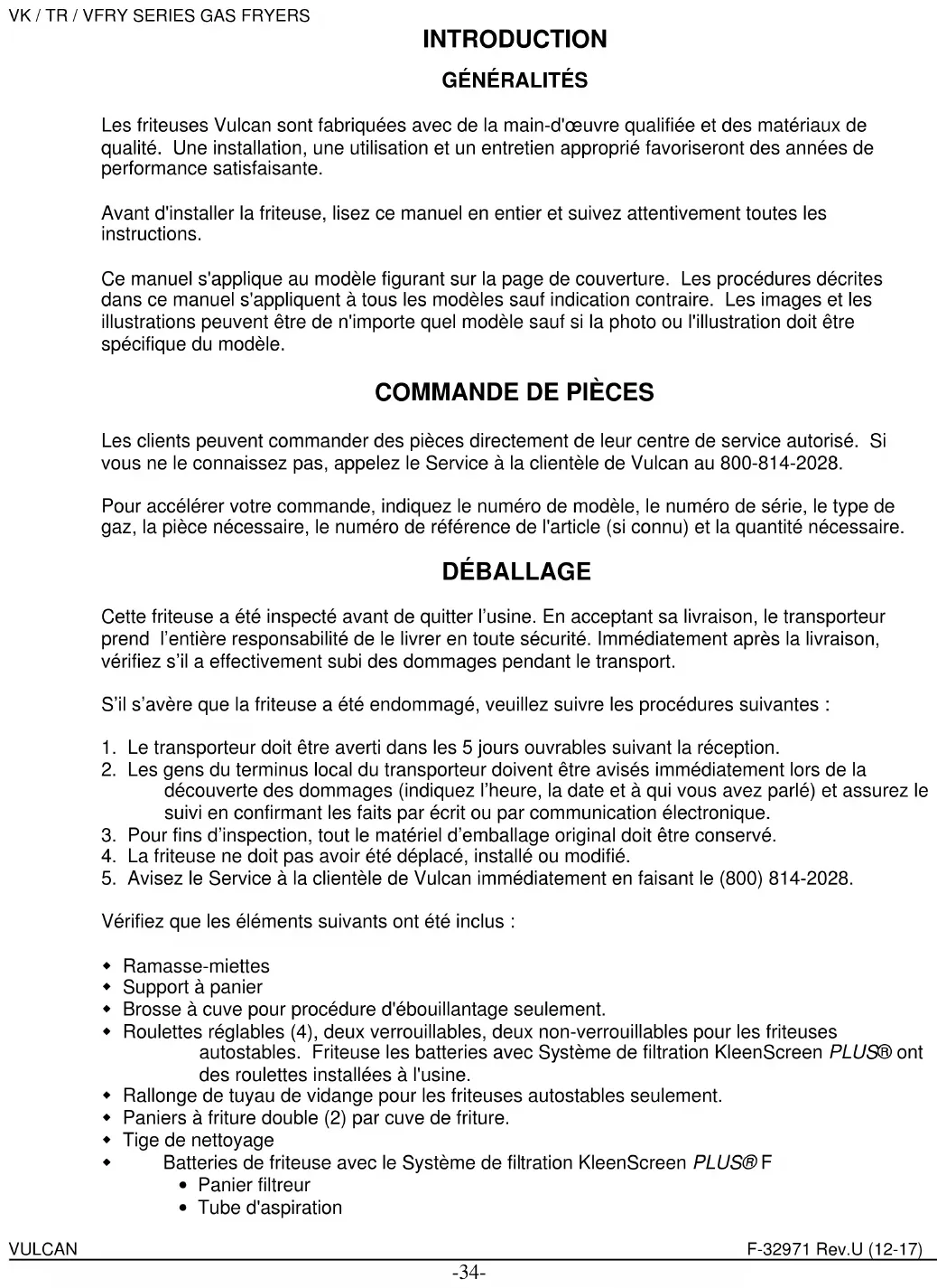 Une installation, un ajustement, une modification, une réparation ou un entretien inapproprié peuvent entraîner des dommages, des blessures ou la mort. Lire attentivement les directives d'installation, d'utilisation et d'entretien avant d'installer ou de faire l'entretien de cet appareil.VK / TR / VFRY SERIES GAS FRYERS VULCAN F-32971 Rev.U (12-17)