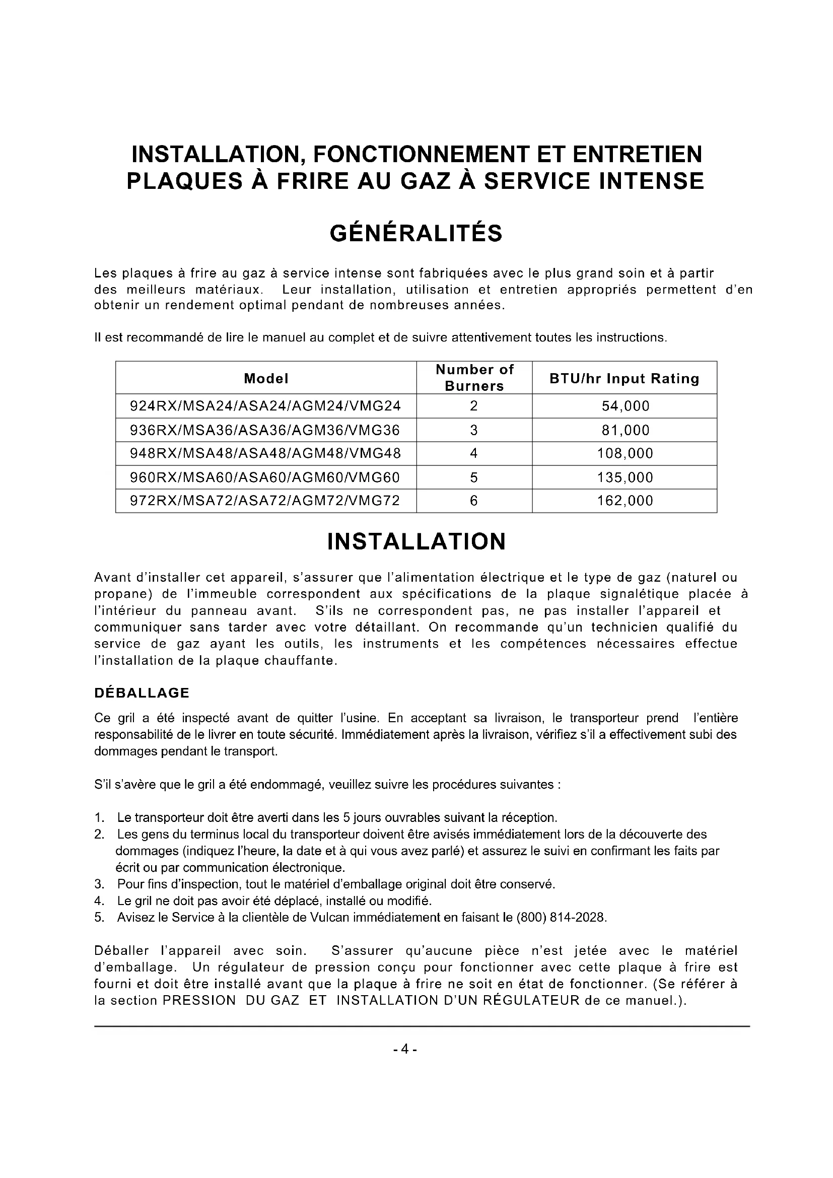 Les plaques à frire au gaz à service intense sont fabriquées avec le plus grand soin et à partir des meilleurs matériaux. Leur installation, utilisation et entretien appropriés permettent d’en obtenir un rendement optimal pendant de nombreuses années. Il est recommandé de lire le manuel au complet et de suivre attentivement toutes les instructions. Model Number of Burners BTU/hr Input Rating